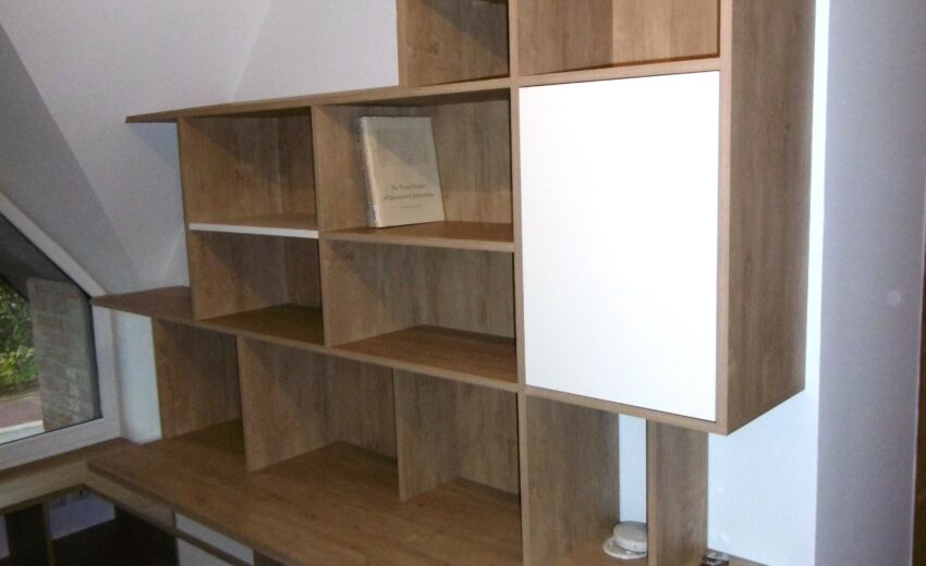 Vous avez besoin d’un bureau pour votre travail ou pour une chambre d’enfants ? Kiosque Aménagement vous propose un large choix d’aménagements d’espace bureau, adapté à la configuration de vos pièces et à votre utilisation. Il pourra s’agir d’un bureau avec bibliothèque intégrée ou même d’un bureau escamotable. Quels que soient les matériaux choisis pour votre aménagement de bureau sur mesure (placage, mélaminé, …) et la finition sélectionnée, gagnez de la place et de la surface de rangement. En effet, votre aménagement de bureau à la maison vous offre la possibilité d’exploiter les espaces perdus de votre pièce et de gagner un maximum de surface de travail et de rangement. Des étagères pourront être aménagées sous des combles. Faites appel à notre équipe pour trouver LA disposition idéale et propice à la créativité.