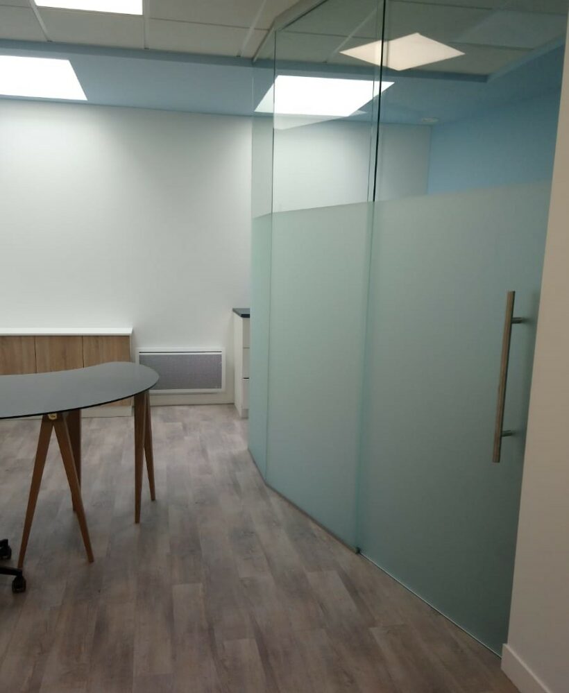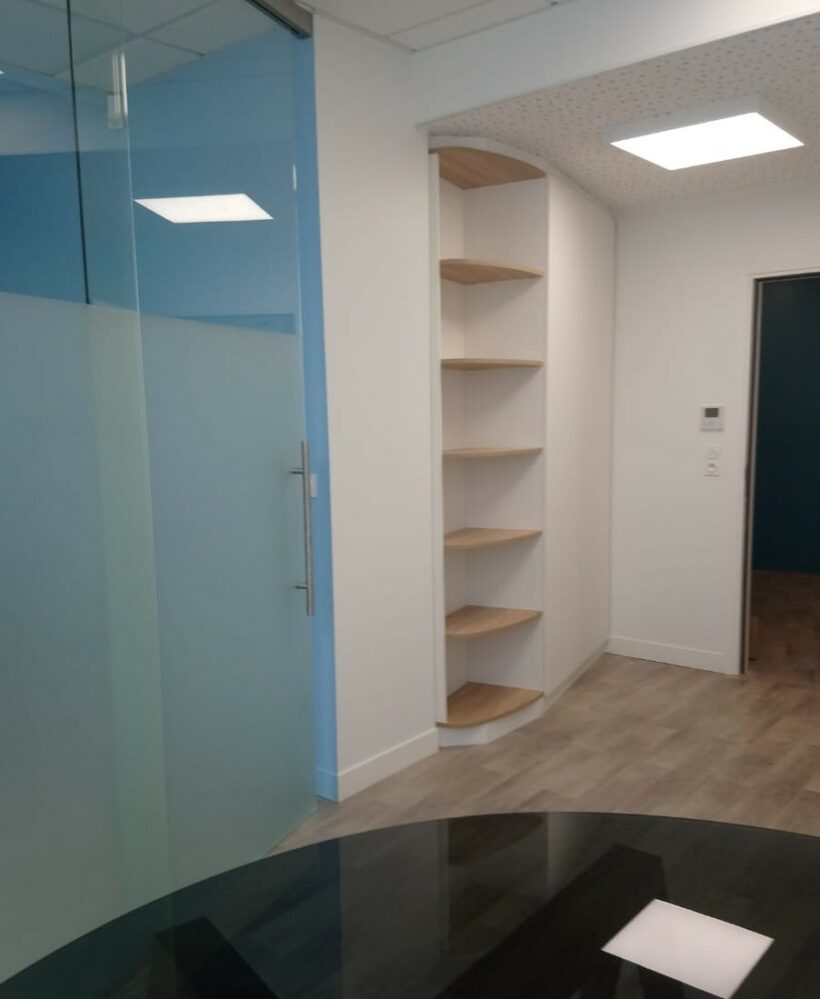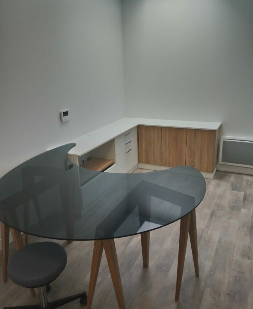 Agencement complet d’un cabinet de gynécologie près de Lille, comprenant le bureau en verre fumé, de nombreux rangements, tablettes et tiroirs, une cloison et une séparation coulissantes en verre sablé.