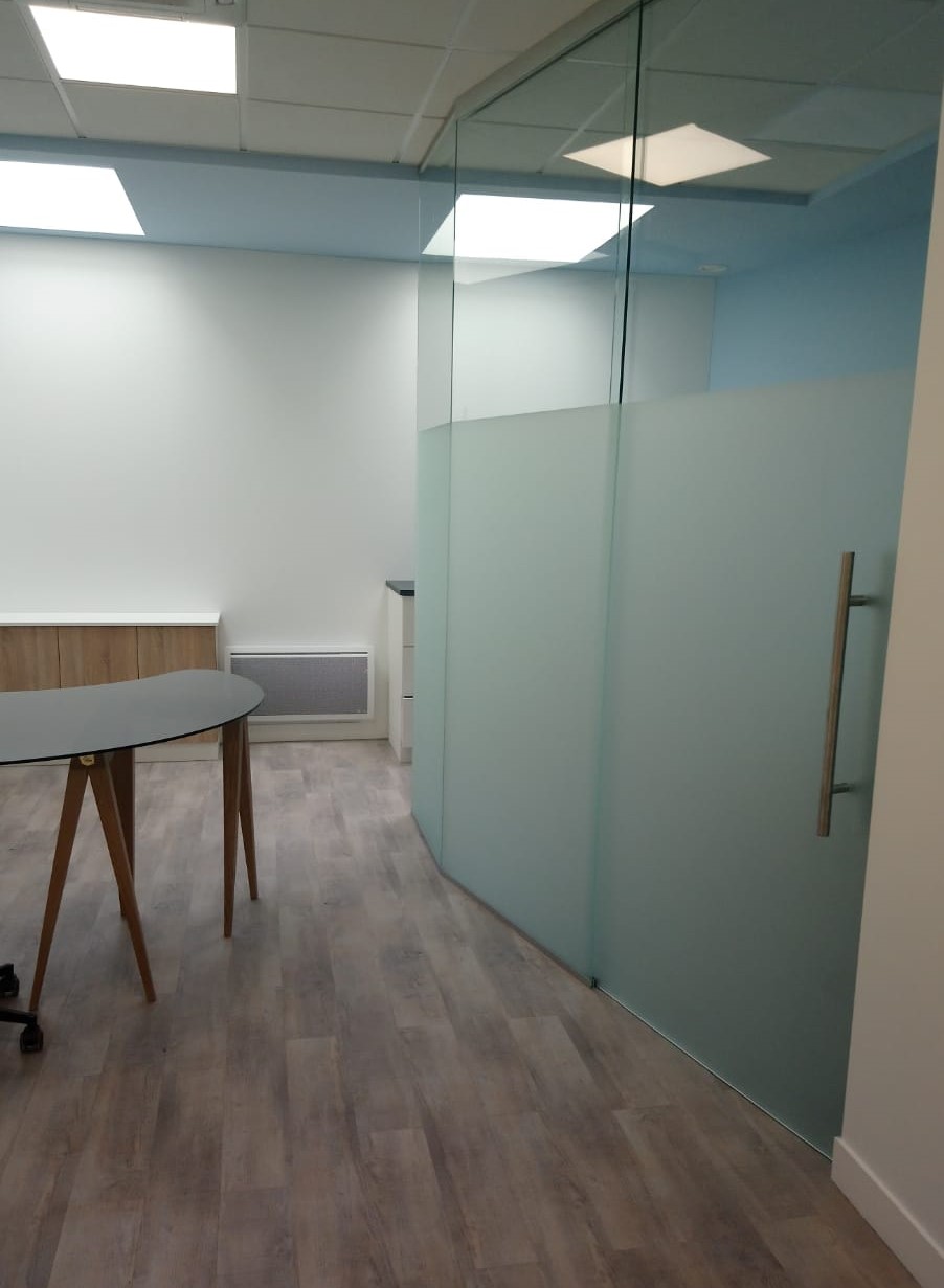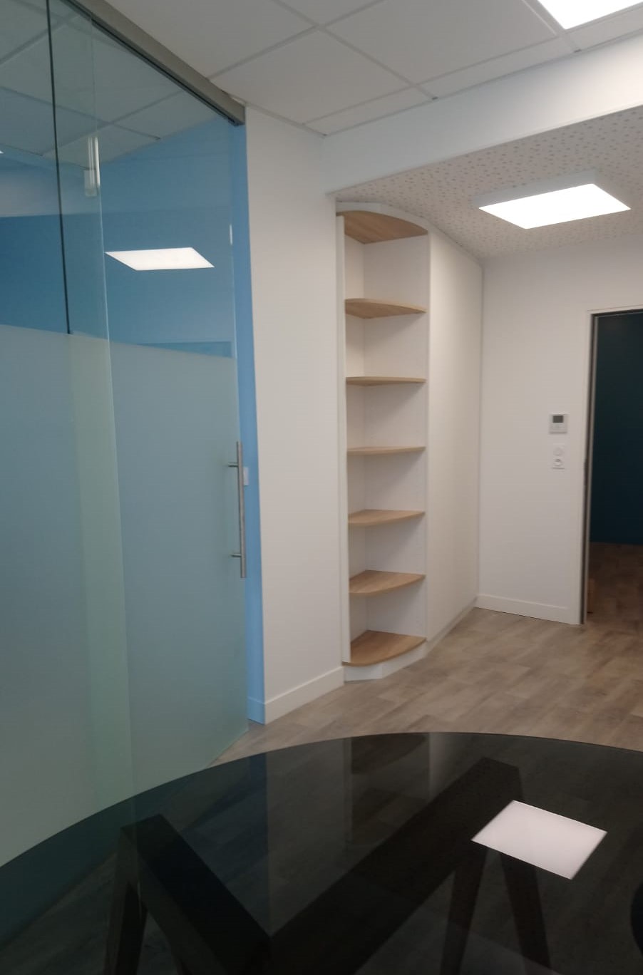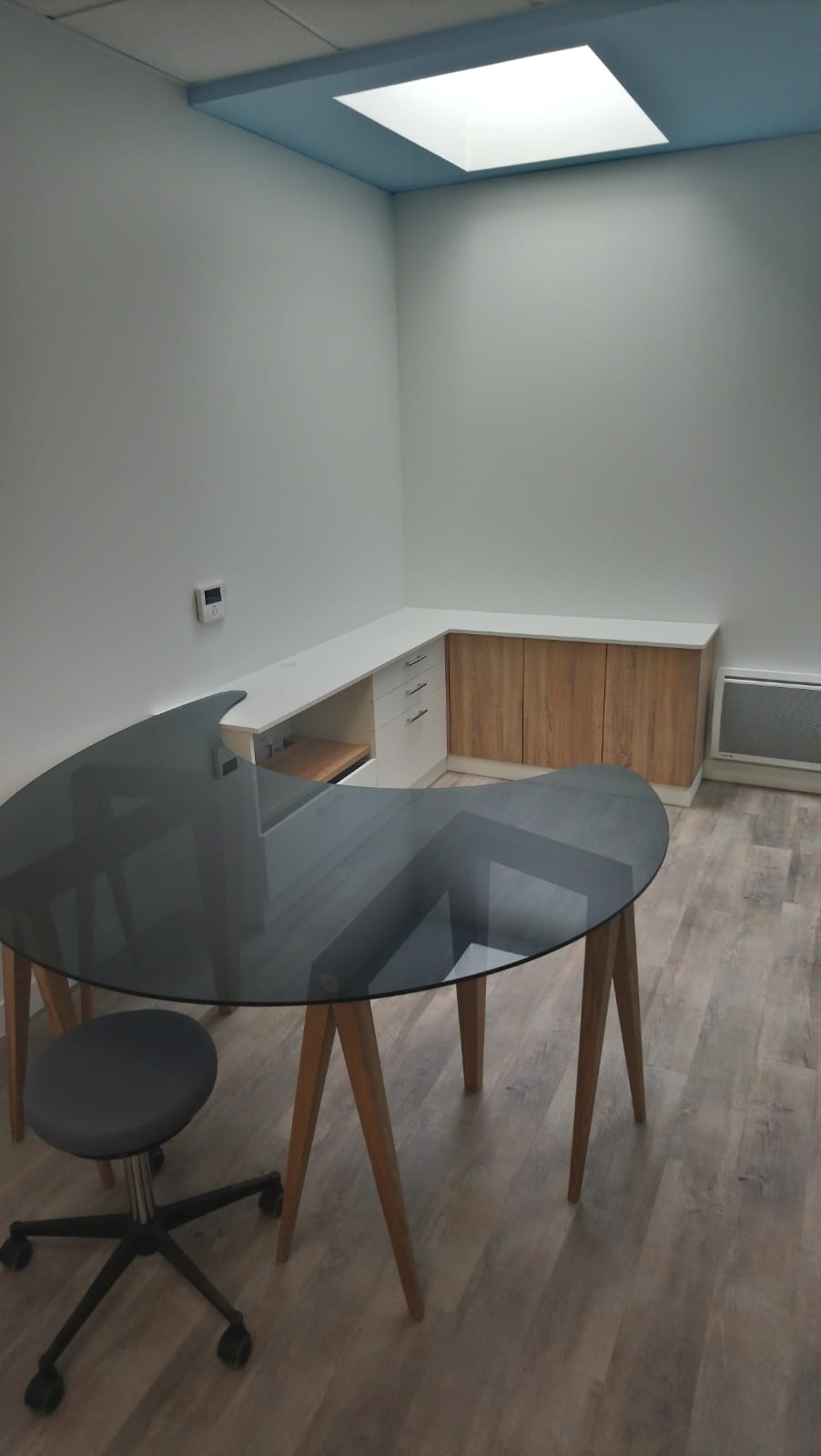 Agencement complet d’un cabinet de gynécologie près de Lille, comprenant le bureau en verre fumé, de nombreux rangements, tablettes et tiroirs, une cloison et une séparation coulissantes en verre sablé.