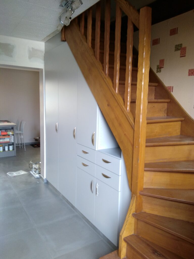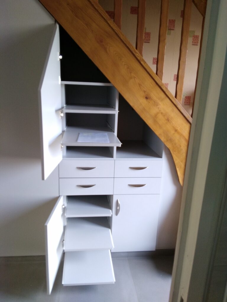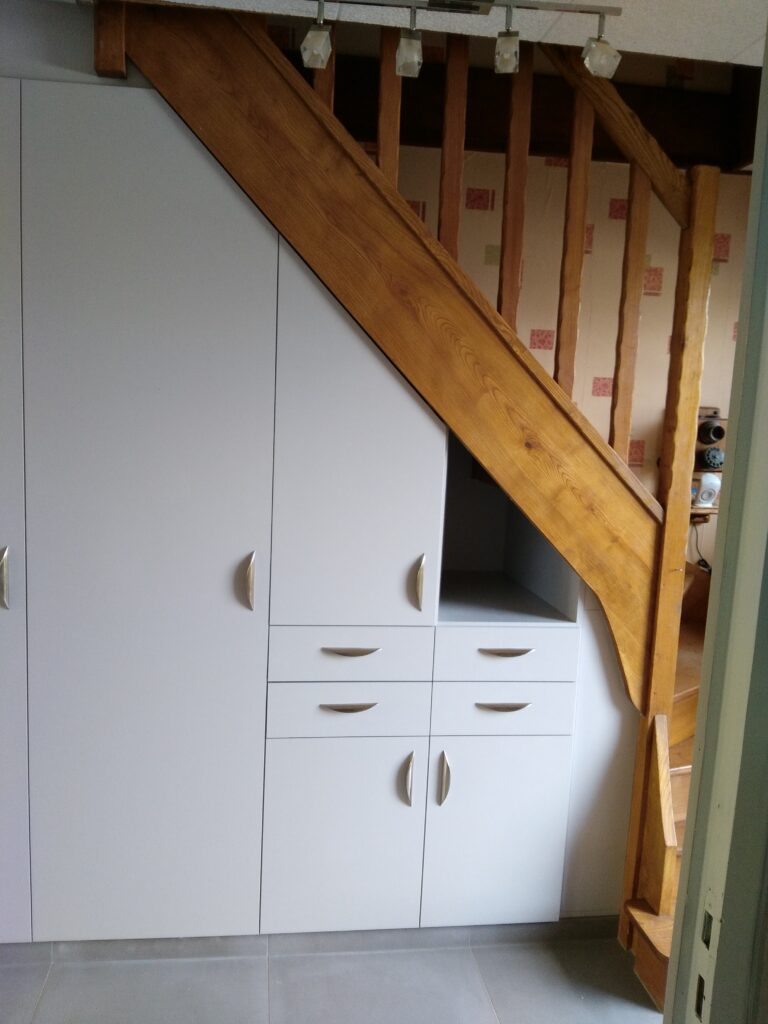 agencement sous escalier sur mesure avec portes battantes, 4 tiroirs et tablettes coulissantes. L’ensemble réalisé en panneaux de particules mélaminé à Bachy (59)
