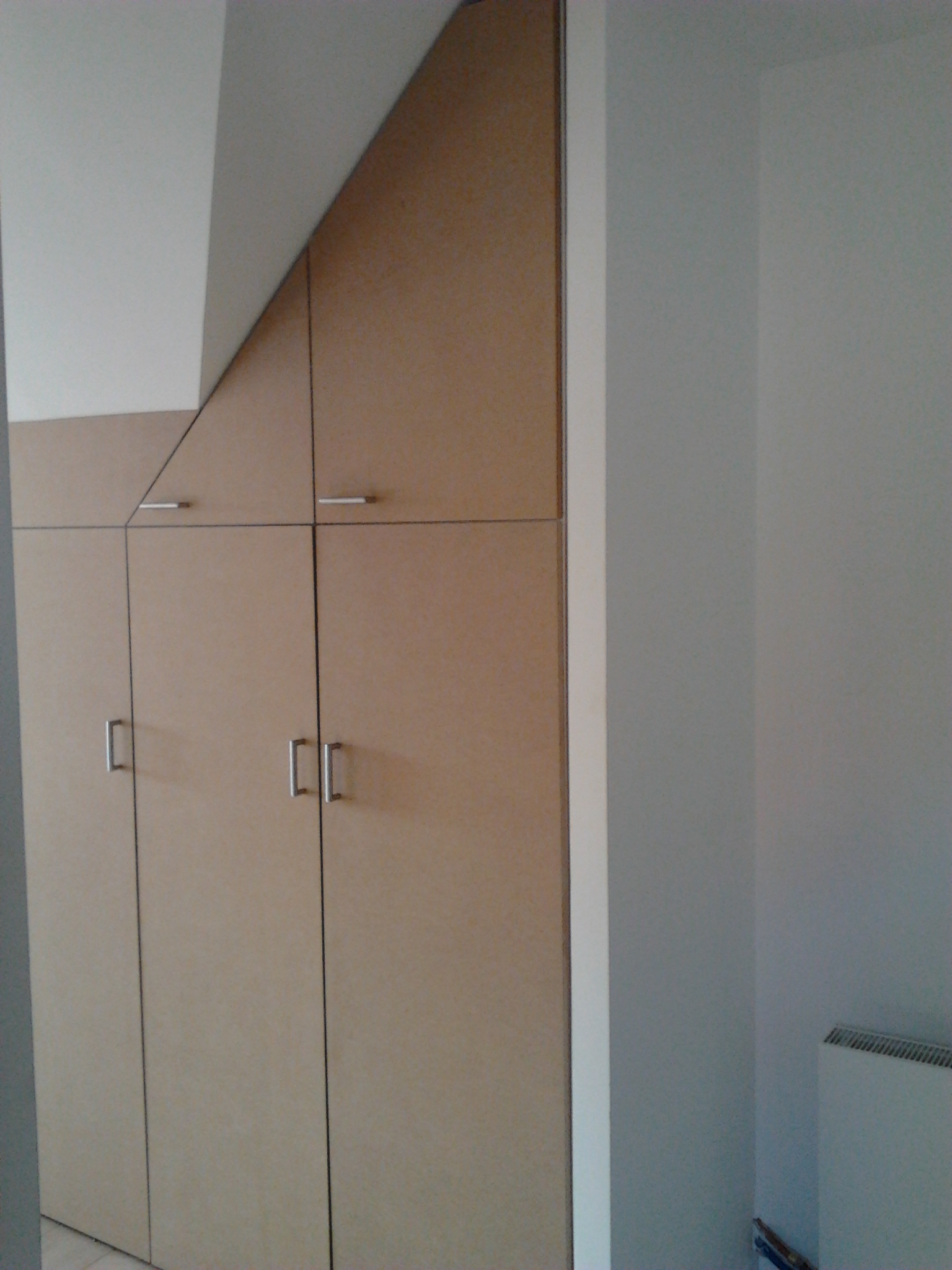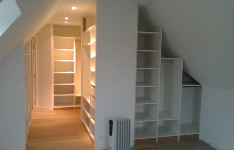 Agencements sur mesure en mélaminé blanc et portes en MDF sous une double mansarde