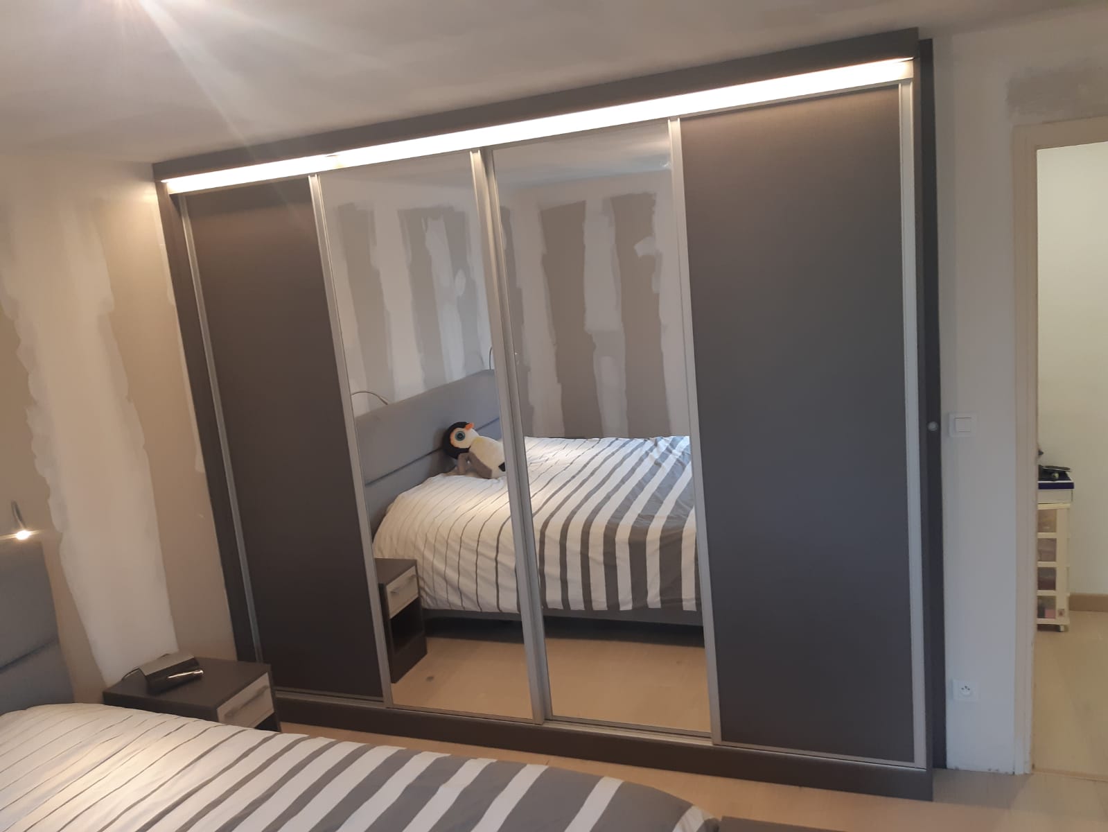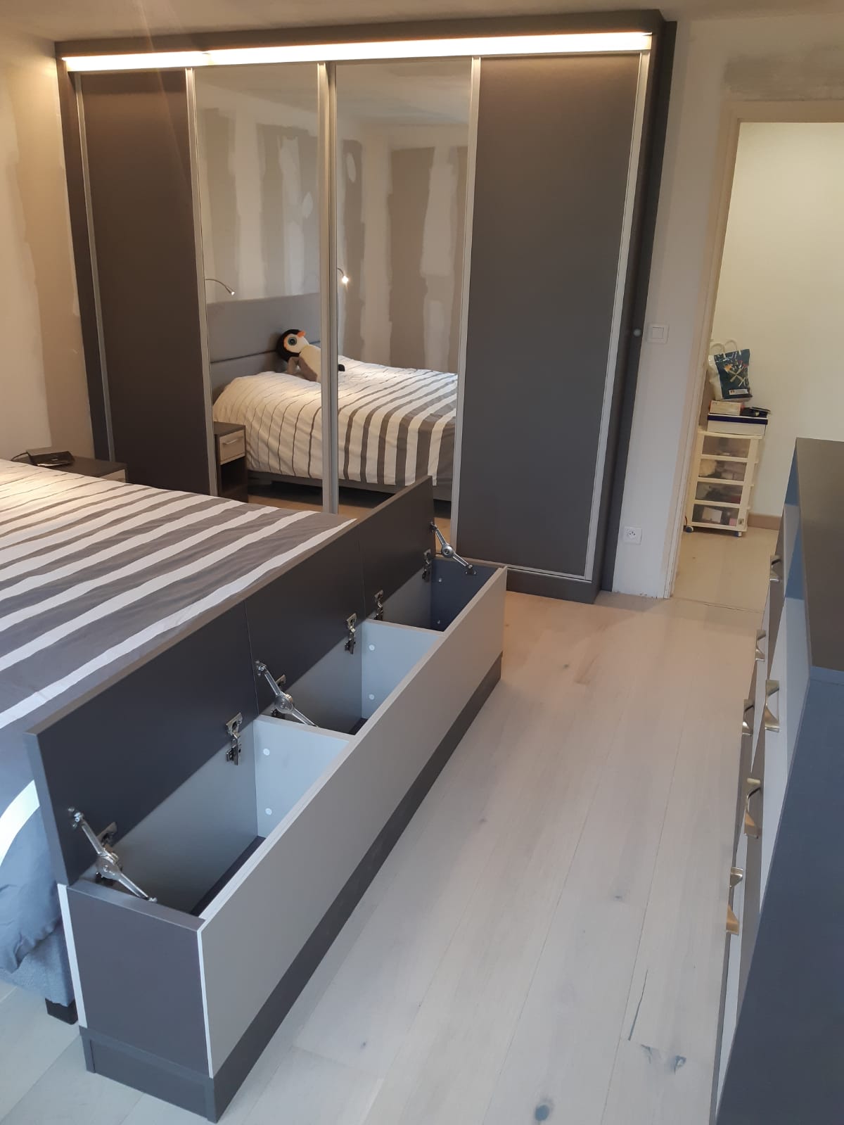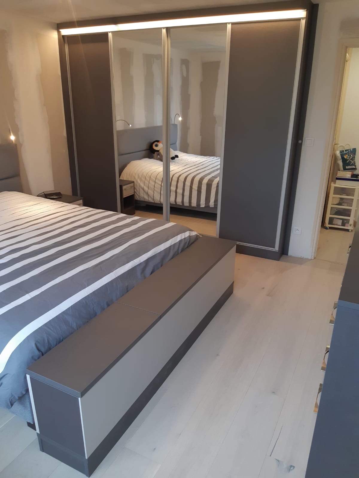 Nous avons réalisé l’aménagement complet d’une chambre. Ce projet a été conçu entièrement sur mesure afin d’apporter le meilleur des résultats à nos clients. En effet, nous y avons installé dans un premier temps un dressing sur mesure avec porte coulissante. Ce dernier comprend une bande lumineuse pour apporter encore plus de valeur à l’agencement.