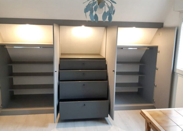 Enfin, la réalisation de l’aménagement de combles à Wavrin répond à l’ensemble des critères fixés par nos clients initialement. Le résultat final constitue un réel gain de confort pour ces derniers de par son côté confort et son design original. Afin de mettre en valeur le meuble, nous avons installé des jeux de lumière.