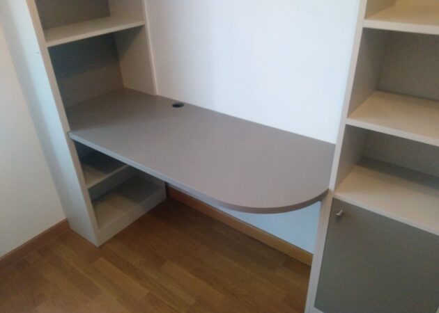 En effet, plein de solutions sont possibles en fonction de vos besoins de rangement, votre organisation familiale et les espaces disponibles. Nous avons opté pour une structure bibliothèque avec un bureau dont le plan de travail a une forme cintrée. Effectivement, cela permet d’adoucir les lignes du meuble sur mesure.