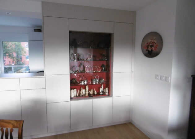 En effet, pour éviter une rupture trop brutale entre la cuisine et le reste des pièces à vivre, concevoir un meuble arrière cuisine de rangement semble être la meilleure solution. Ici, nous avons combiné l’aspect bibliothèque et placard sur mesure.