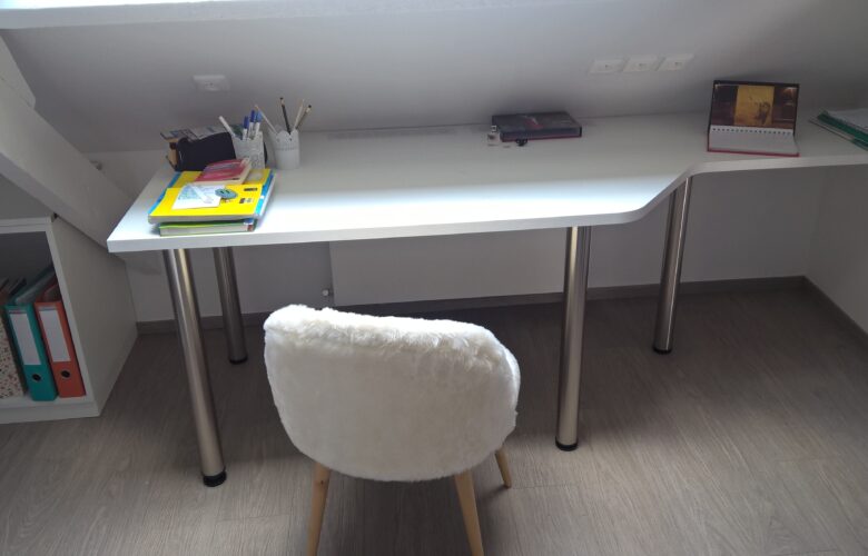 Nous avons également conçu un bureau sur mesure avec un plan de travail libre et une découpe de forme. Cette découpe permet d’alléger l’aménagement de la chambre d’ado et de laisser un peu plus d’espace pour circuler dans la pièce.