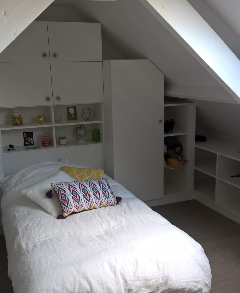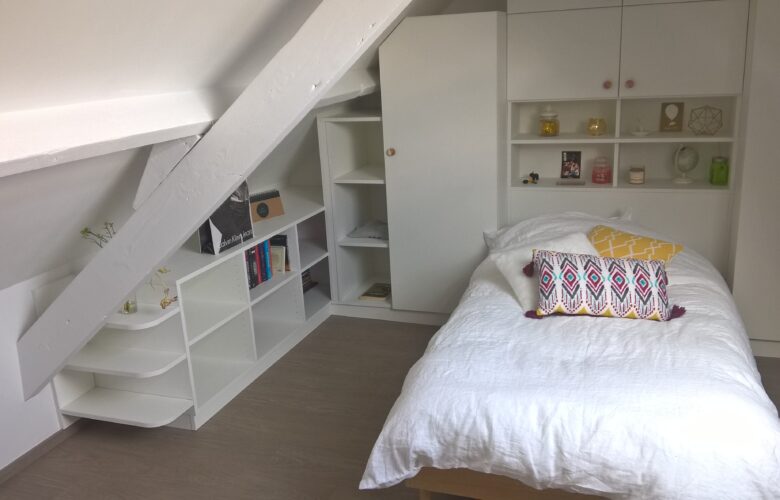 Pour ce projet d’aménagement d’une chambre d’ado sous comble à Marcq-en-Baroeul, nous avons évité le maximum de découpe possible sous les combles. Cela permet d’optimiser notre temps de travail et d’en réduire les coûts. Nous avons réalisé ces agencements sur mesure. En effet, il fallait travailler en tenant compte de l’angle important présent dans la pièce. Ce type de procédé permet d’optimiser au mieux l’espace et donc d’obtenir un résultat des plus précis. Enfin, cet aménagement de chambre d’ado sous comble respecte tous les critères exigés par nos clients.