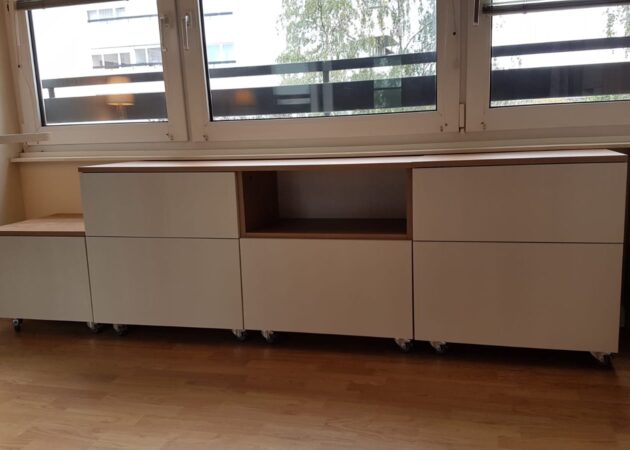 Nous avons réalisé l’aménagement d’une pièce en bureau par le biais de meuble sur mesure. En effet, nous avons conçu différents meubles pour créer un ensemble. Tout en sachant qu’une grande partie des meubles bas ont des rangements fermés par des portes battantes ou des tiroirs. Ces espaces permettent à nos clients de pouvoir ranger des affaires. Ce projet a été réalisé entièrement sur mesure. En effet, ce type de procédé permet d’optimiser au mieux l’espace disponible dans la pièce et ainsi d’obtenir un résultat des plus précis.