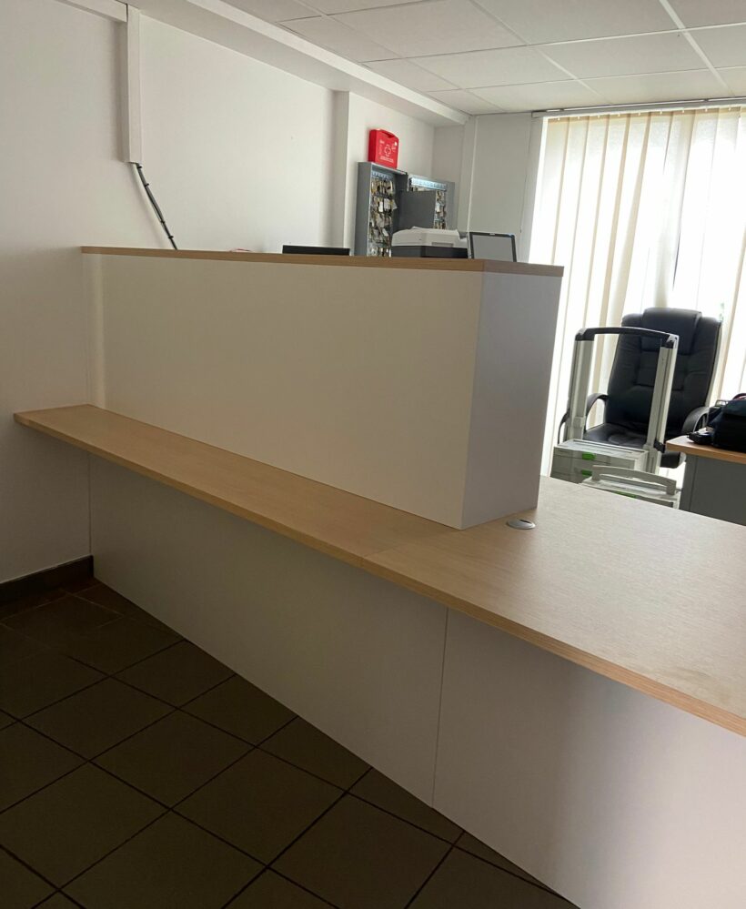 Réalisation en stratifié et mélaminé blanc et chêne.