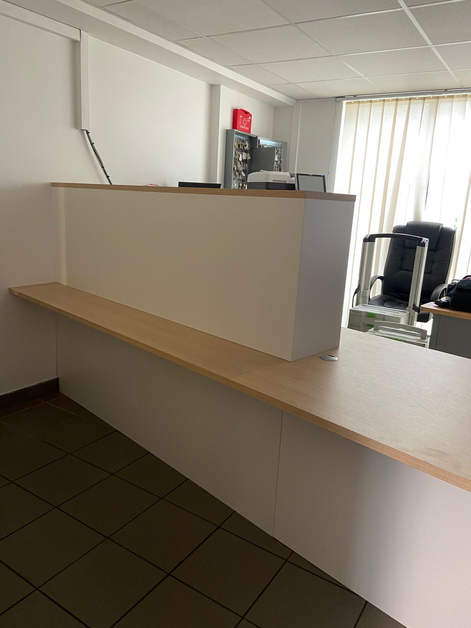 Réalisation en stratifié et mélaminé blanc et chêne.