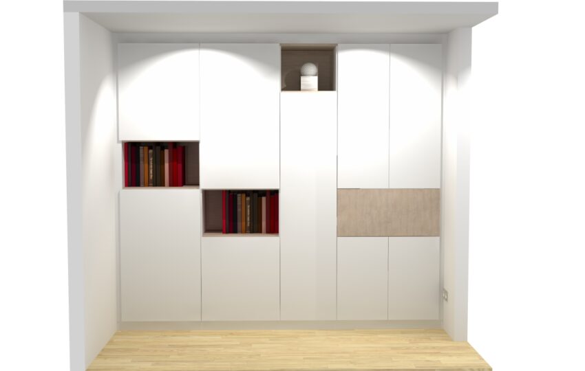 Concernant la bibliothèque, nous avons laissé quelques espaces ouverts afin que nos clients puissent y mettre de la décoration. Néanmoins, la plupart des espaces sont fermés. Ils sont nombreux et permettent d’accueillir beaucoup de rangements. Le fait de combiner les espaces ouverts et fermés permet de donner un joli design au meuble. Nous avons également veillé à conserver le même code couleur que celui présent dans la pièce.
