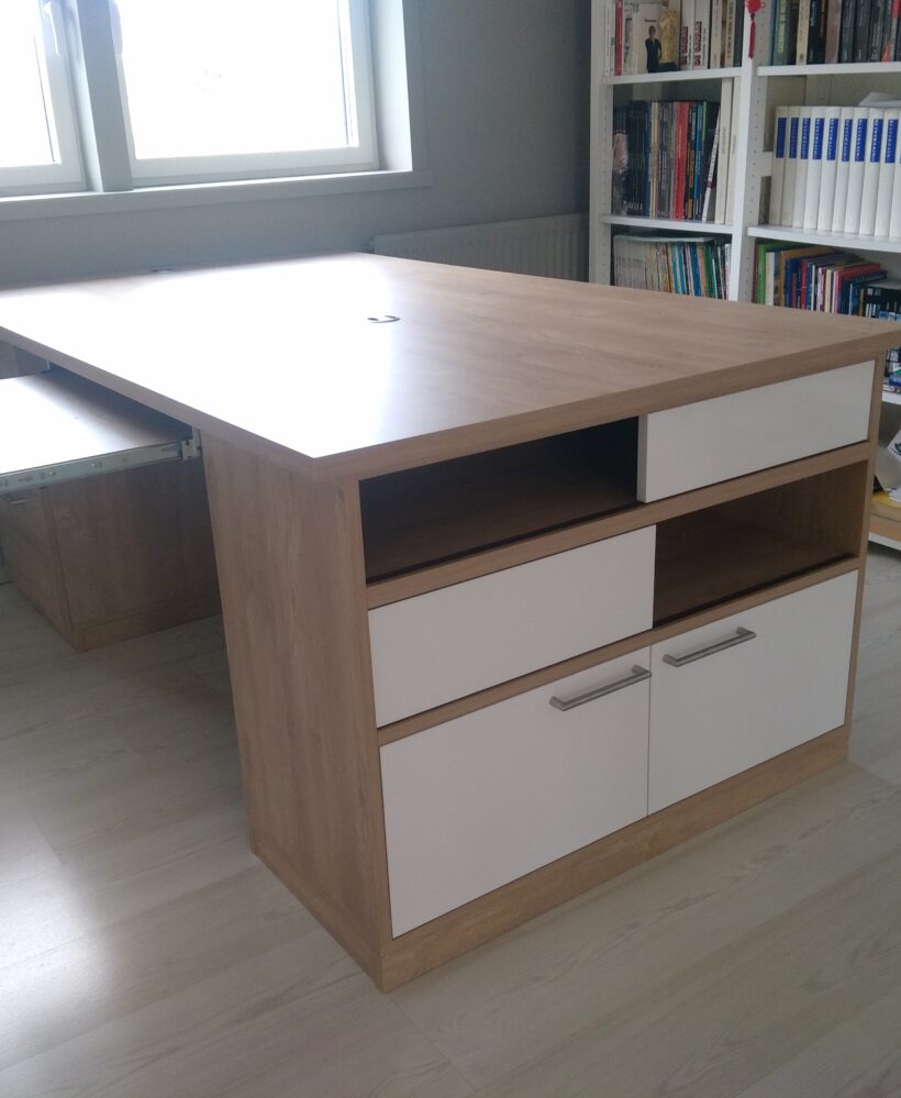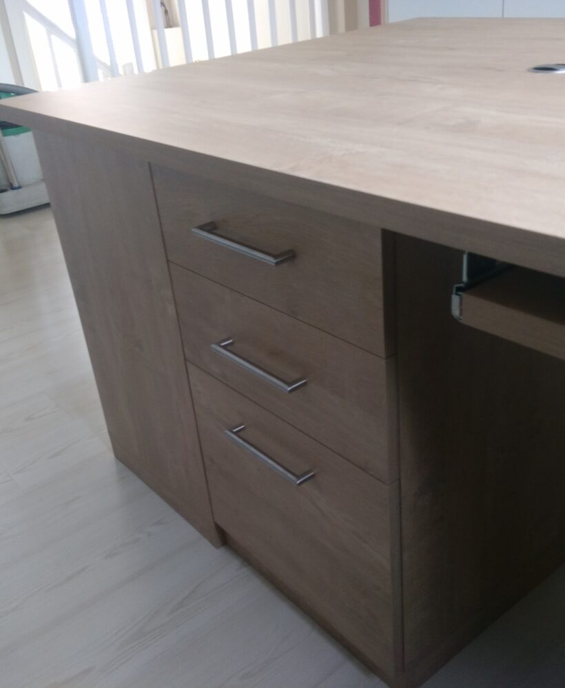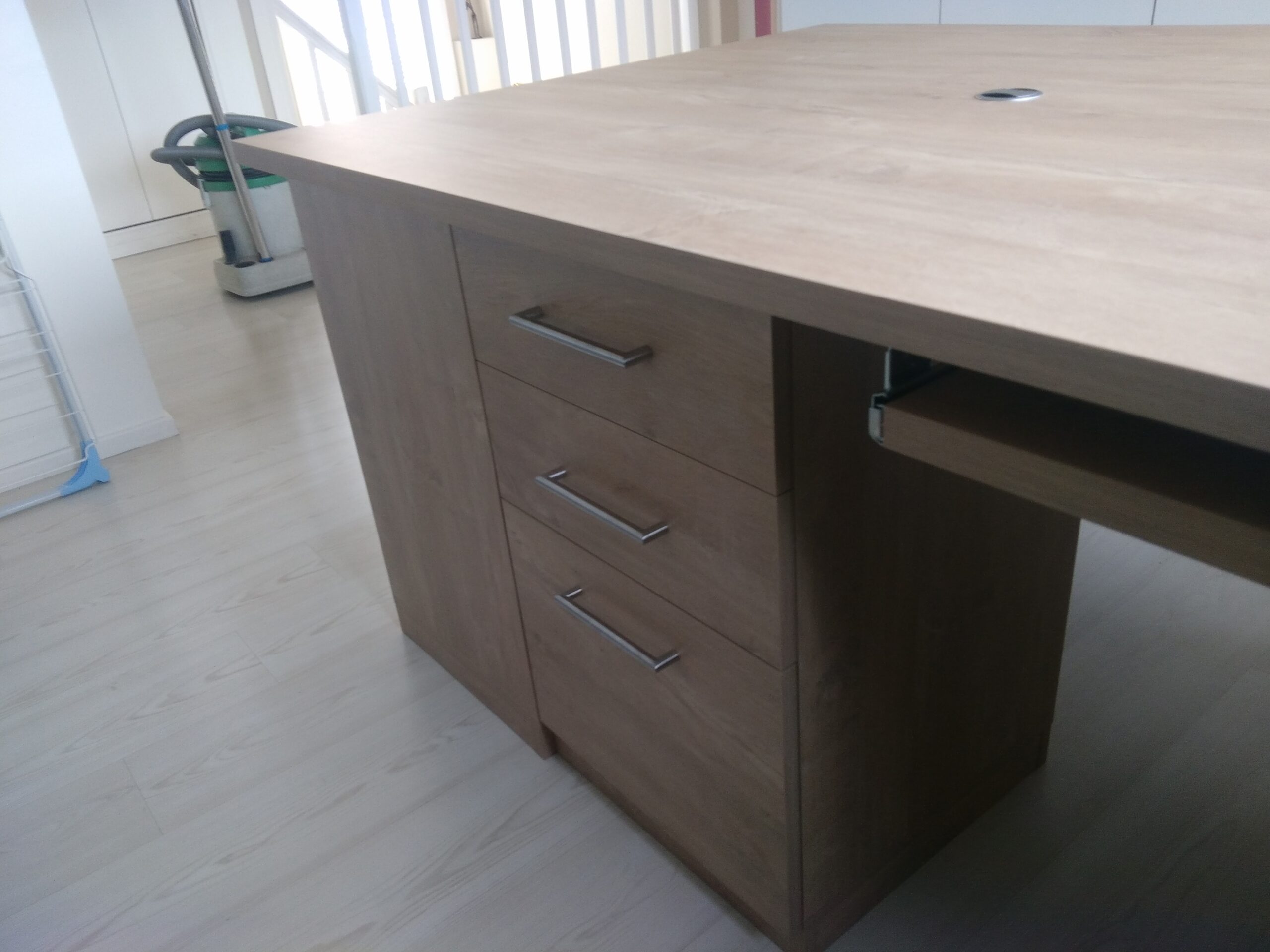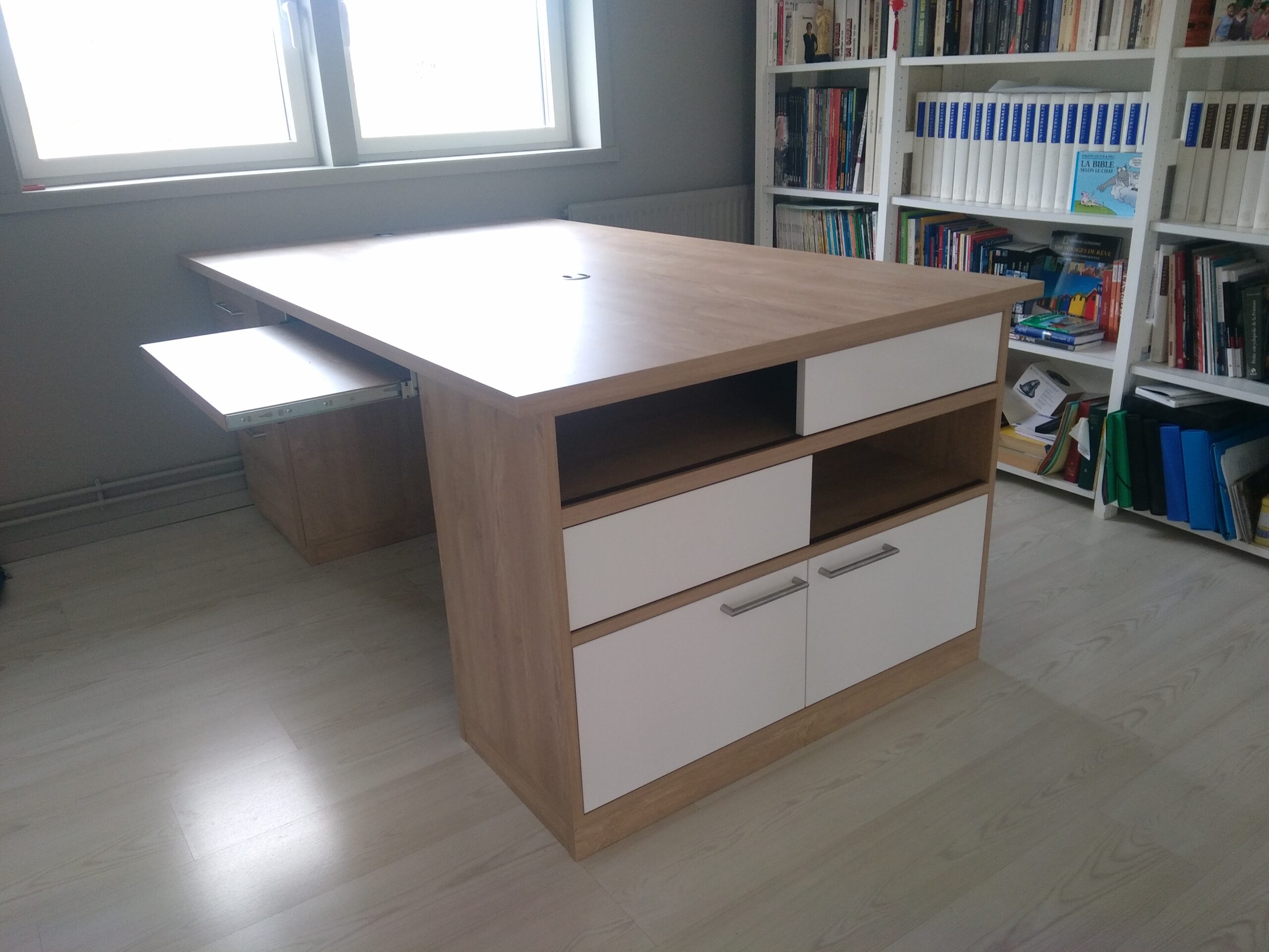 Bureau sur mesure avec deux postes de travail réalisé à Villeneuve d’Ascq . Il comprend deux postes de travail , l’un en face de l’autre . Ainsi , chaque poste comprend un bloc tiroir et une tablette coulissante .