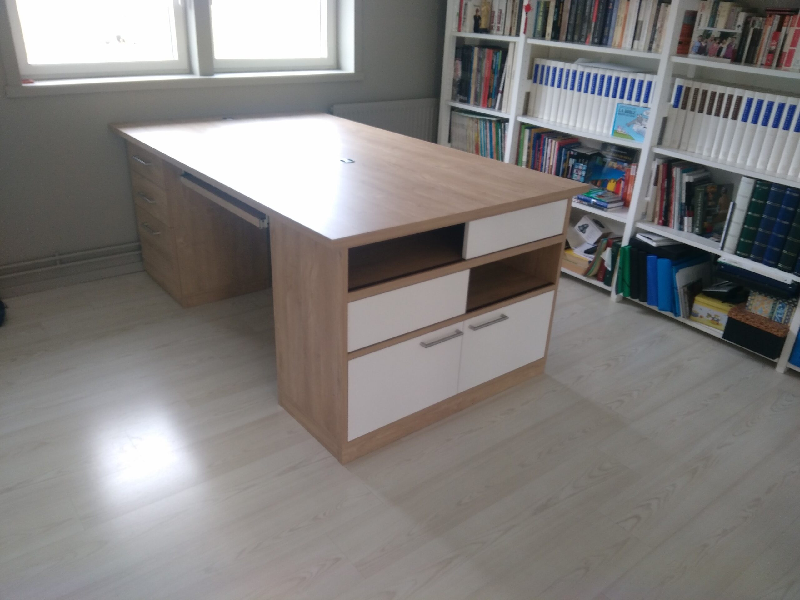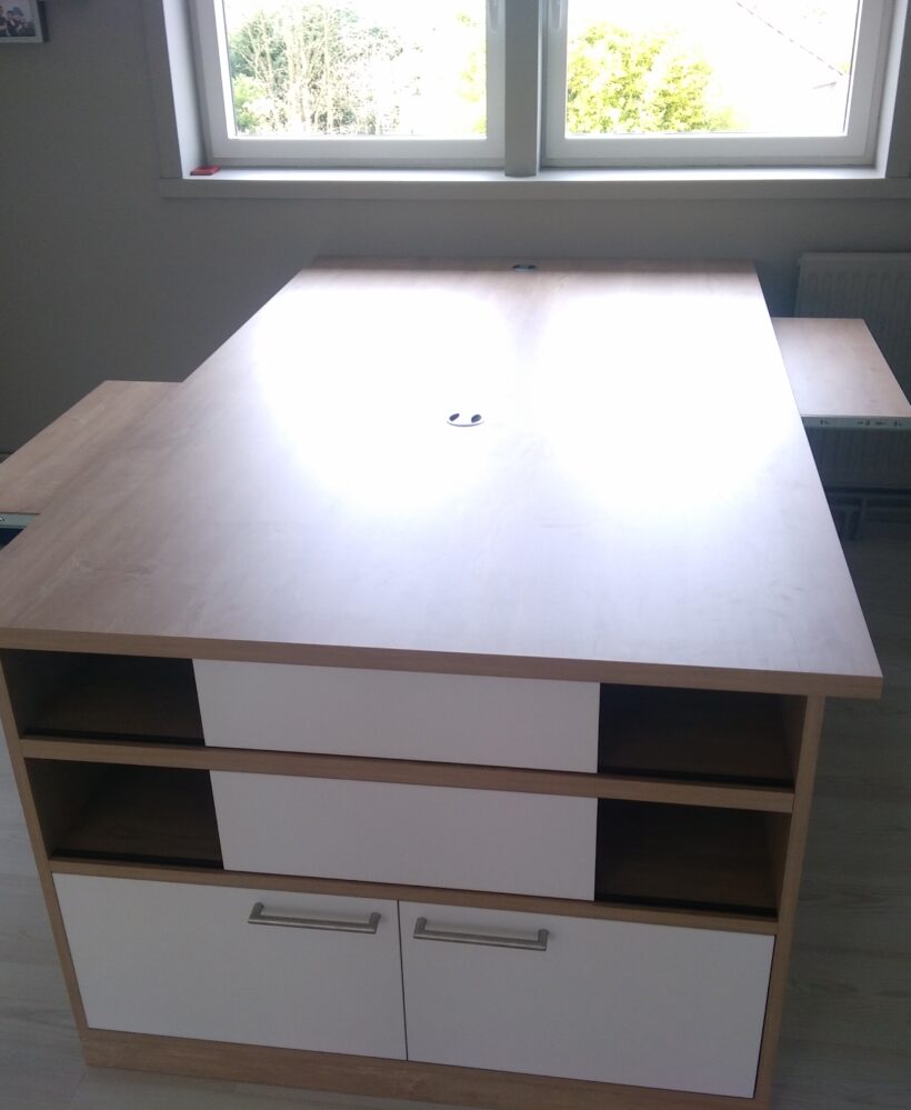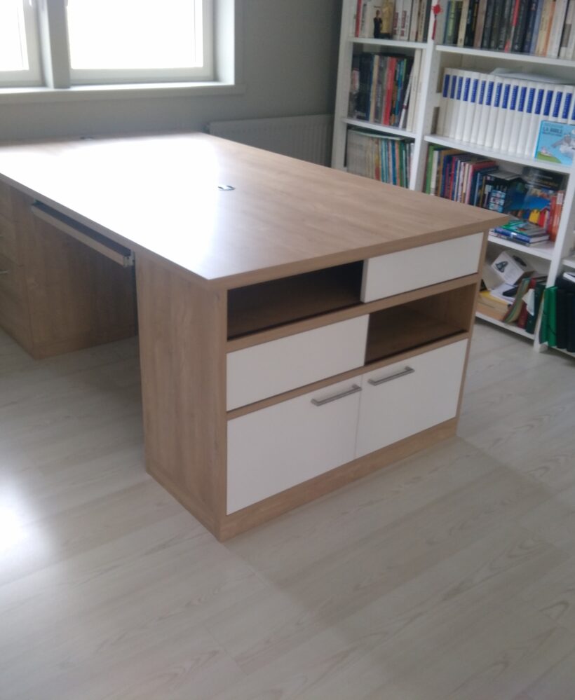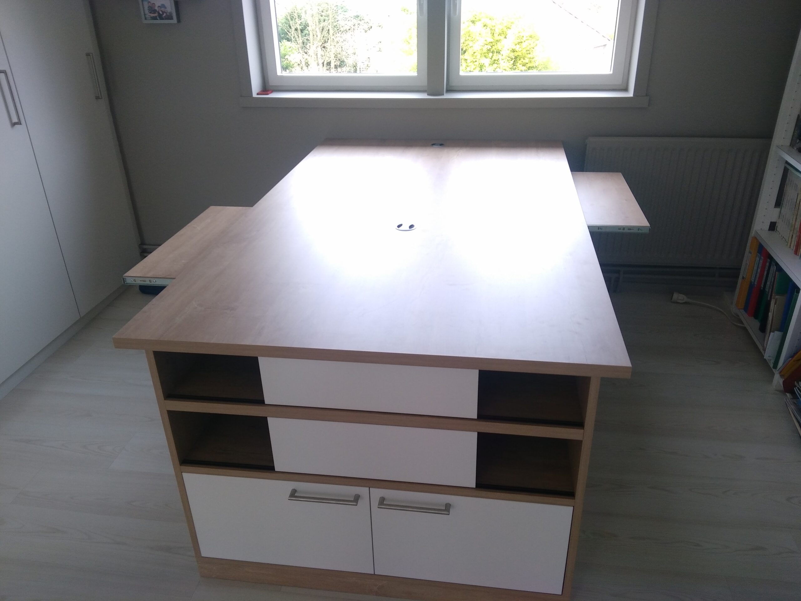 Bureau sur mesure avec deux postes de travail réalisé à Villeneuve d’Ascq . Il comprend deux postes de travail , l’un en face de l’autre . Ainsi , chaque poste comprend un bloc tiroir et une tablette coulissante .
