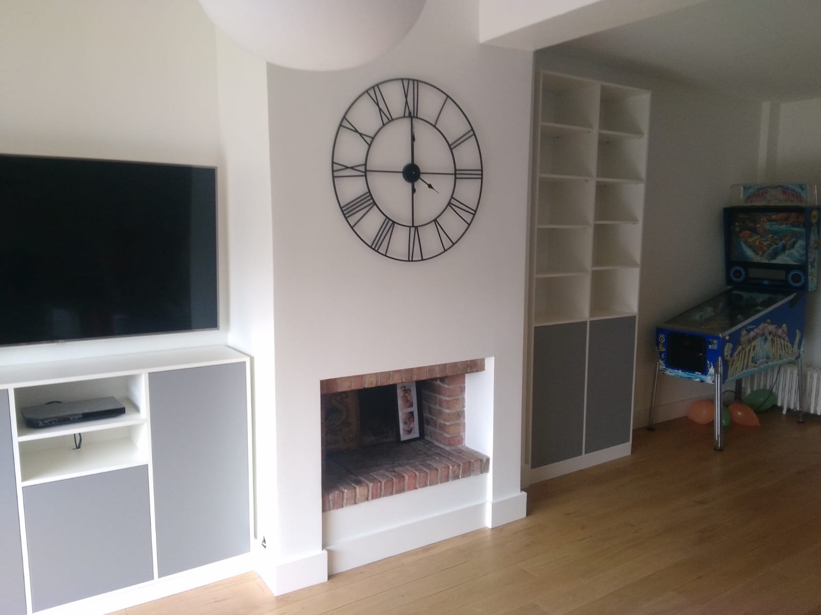 Dans un premier temps, le côté pratique a été développé. En effet, on y trouve l’espace pour la télévision et sur le côté un espace bibliothèque. De plus, à gauche de la cheminée, nous avons également réalisé une autre bibliothèque. Elle permet de créer une continuité dans la pièce. Ainsi, nos clients bénéficient de nombreux espaces de rangements. Nous avons également intégré des espaces ouverts destinés à accueillir de la décoration.