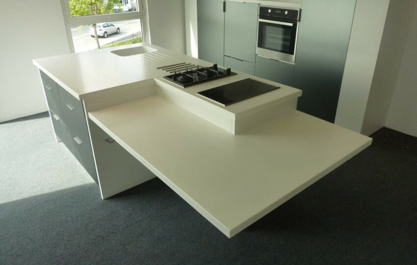 Enfin, la réalisation de cette cuisine avec plan de travail en Corian répond à l’ensemble des critères fixés par nos clients initialement.