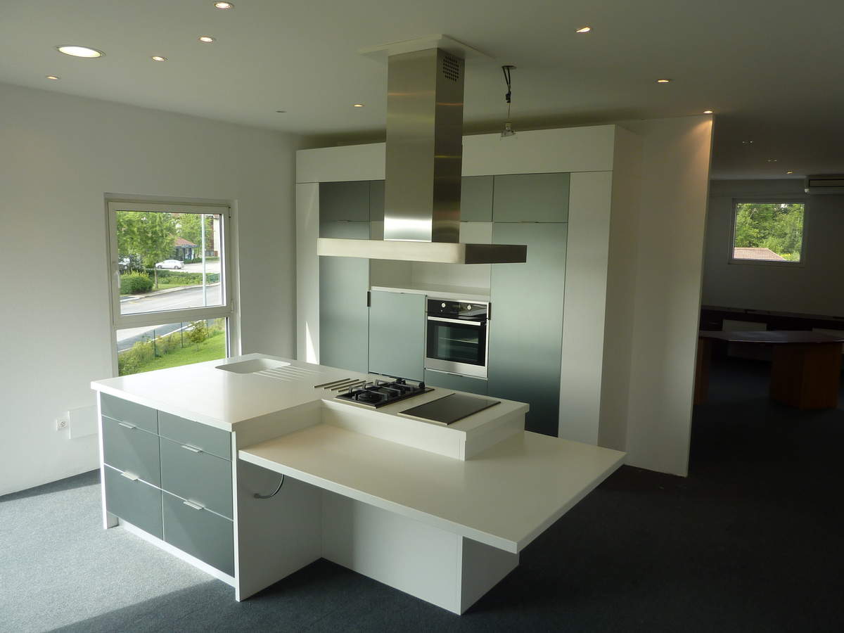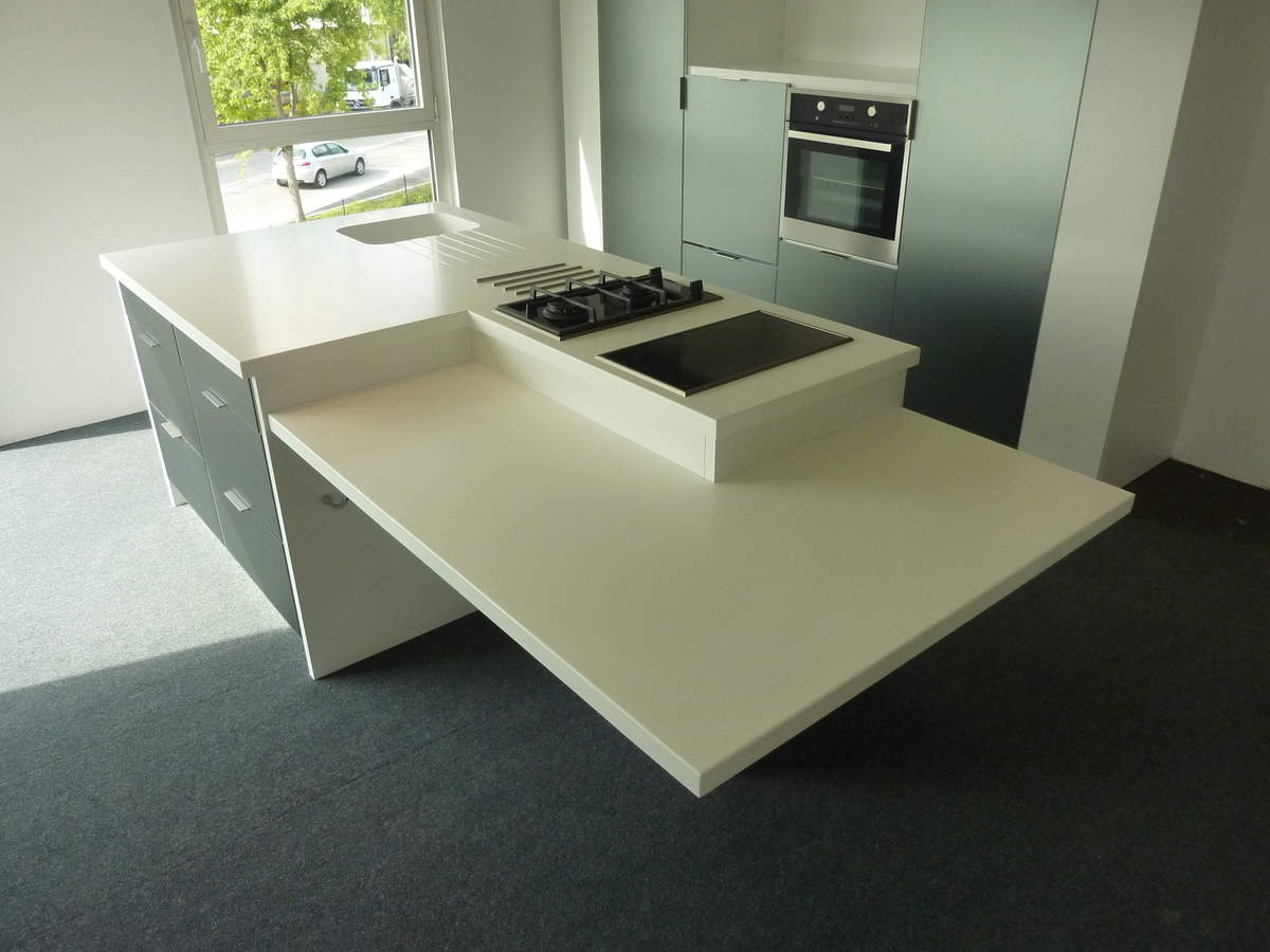 Cuisine avec plan de travail en Corian avec ilot central: Le Corian est un matériau très apprécié en cuisine, car il se travail très facilement. Attention néanmoins aux traces de rayures: un minimum de soin est recommandé.
