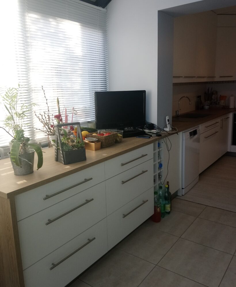 Cette cuisine blanche et bois retrouve donc un design original, ce qui la rend unique. Parfois, il suffit juste de rénover avec les bonnes couleurs. Cela évite d’engager des frais trop importants dans un nouveau projet. Ainsi, cette cuisine s’intègre parfaitement dans la pièce et lui donne un réel charme ! Nos clients pour ce qu’ils nous en ont rapporté, en sont très satisfaits.