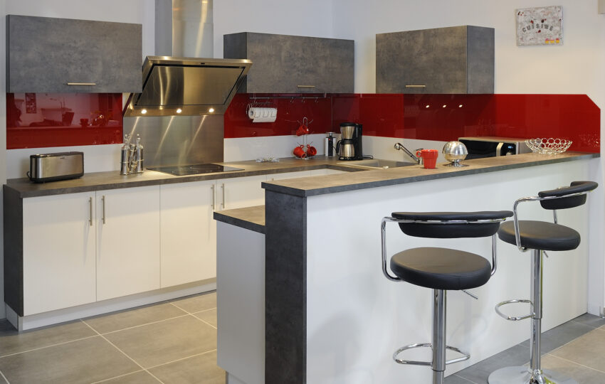 Pour cette cuisine sur mesure verre laqué, nous apportons de véritables suggestions d’agencement. Ainsi le coin repas façon « bar ». Mais aussi la crédence en verre laqué rouge, pour amener de la brillance, et respecter les codes couleur choisis par la cliente.