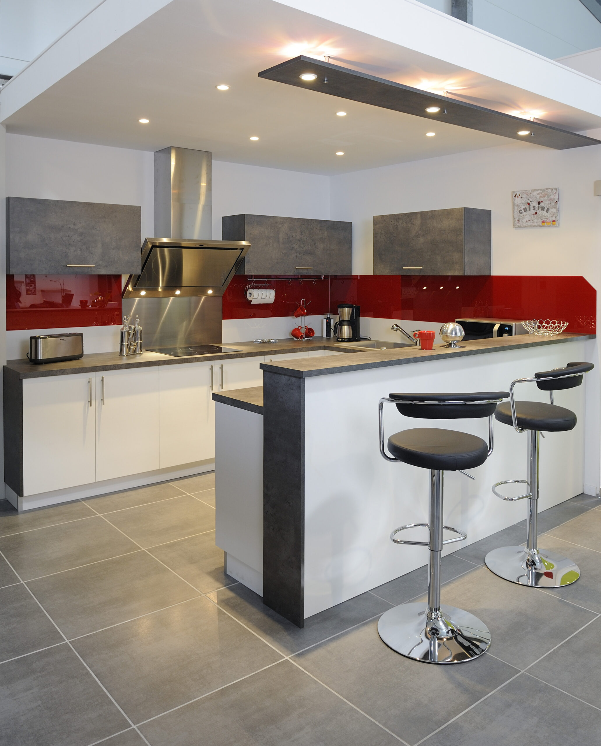 Pour cette cuisine sur mesure verre laqué, nous apportons de véritables suggestions d’agencement. Ainsi le coin repas façon « bar ». Mais aussi la crédence en verre laqué rouge, pour amener de la brillance, et respecter les codes couleur choisis par la cliente.