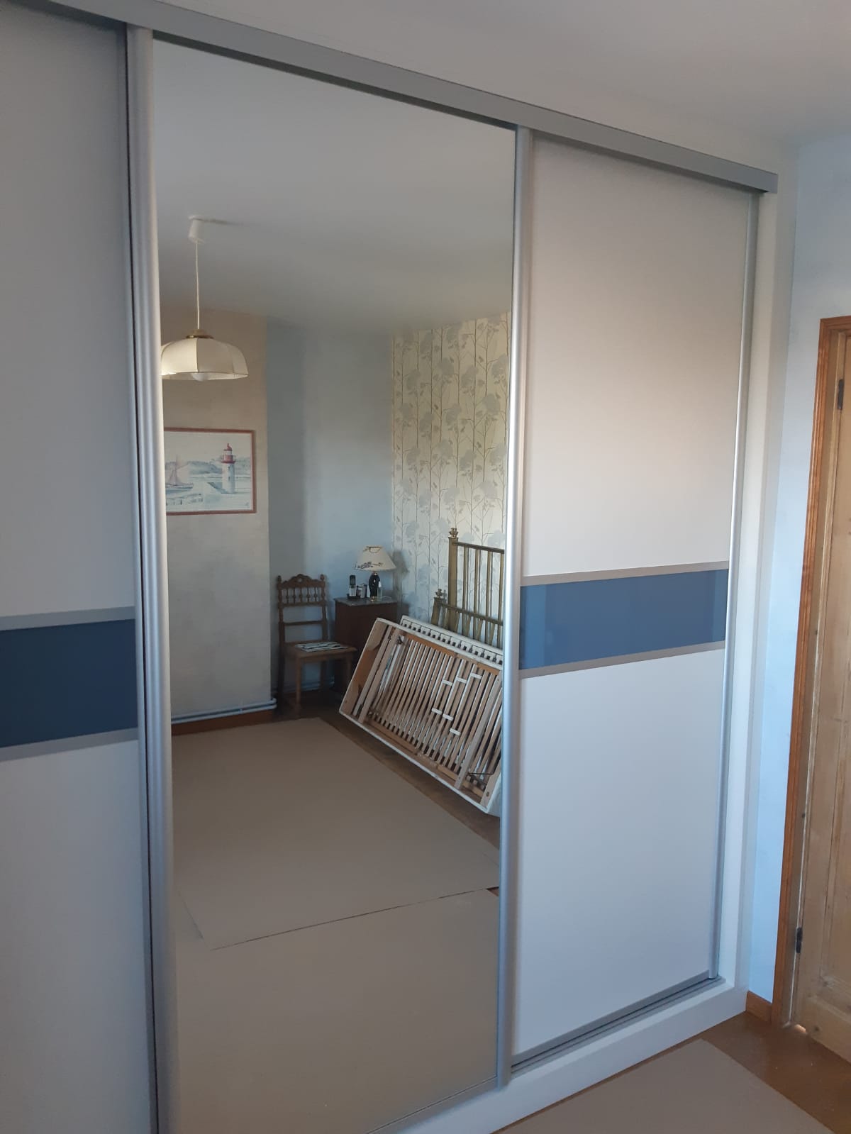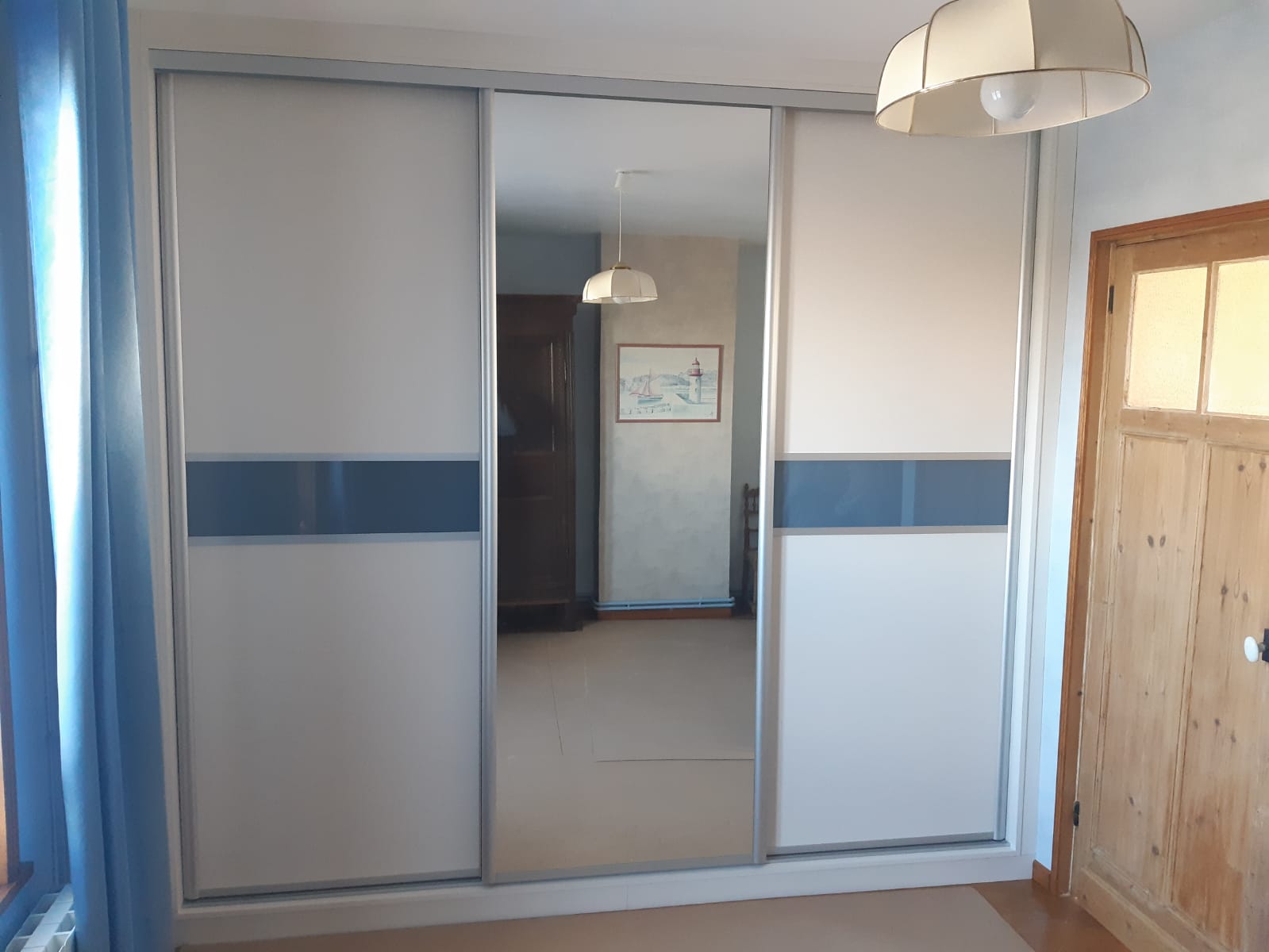 Nous avons personnalisé complètement le projet. En effet, par son rangement intérieur mais surtout son aspect extérieur. Nous avons divisé en 3 les deux portes extérieures en verre laqué ivoire et bleu ombré. Ensuite, pour celle du centre, nous avons installé une porte miroir.