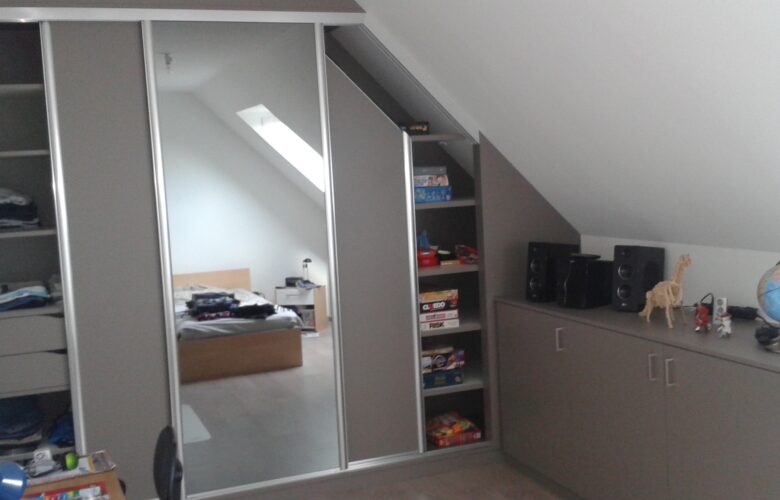 Dressing avec portes coulissantes biseautées et agencement sous mansarde.