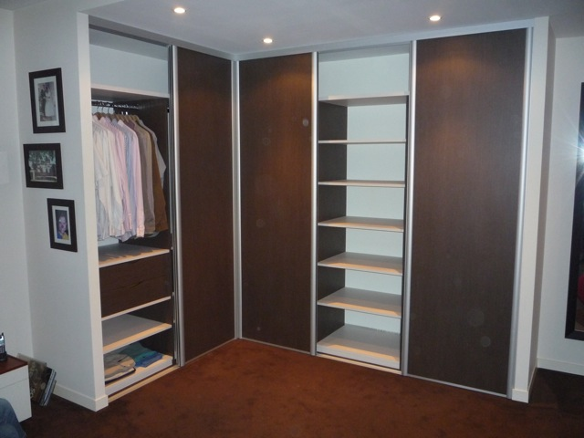 2 fois 2 portes coulissantes pour ce dressing d’angle à Croix. Il a en effet été conçu pour s’ajuster entre 2 murs. Et nous y avons inclus les indispensables de toute garde robes: Tiroirs, tablettes et penderies.