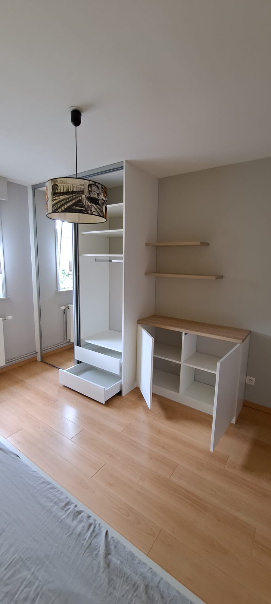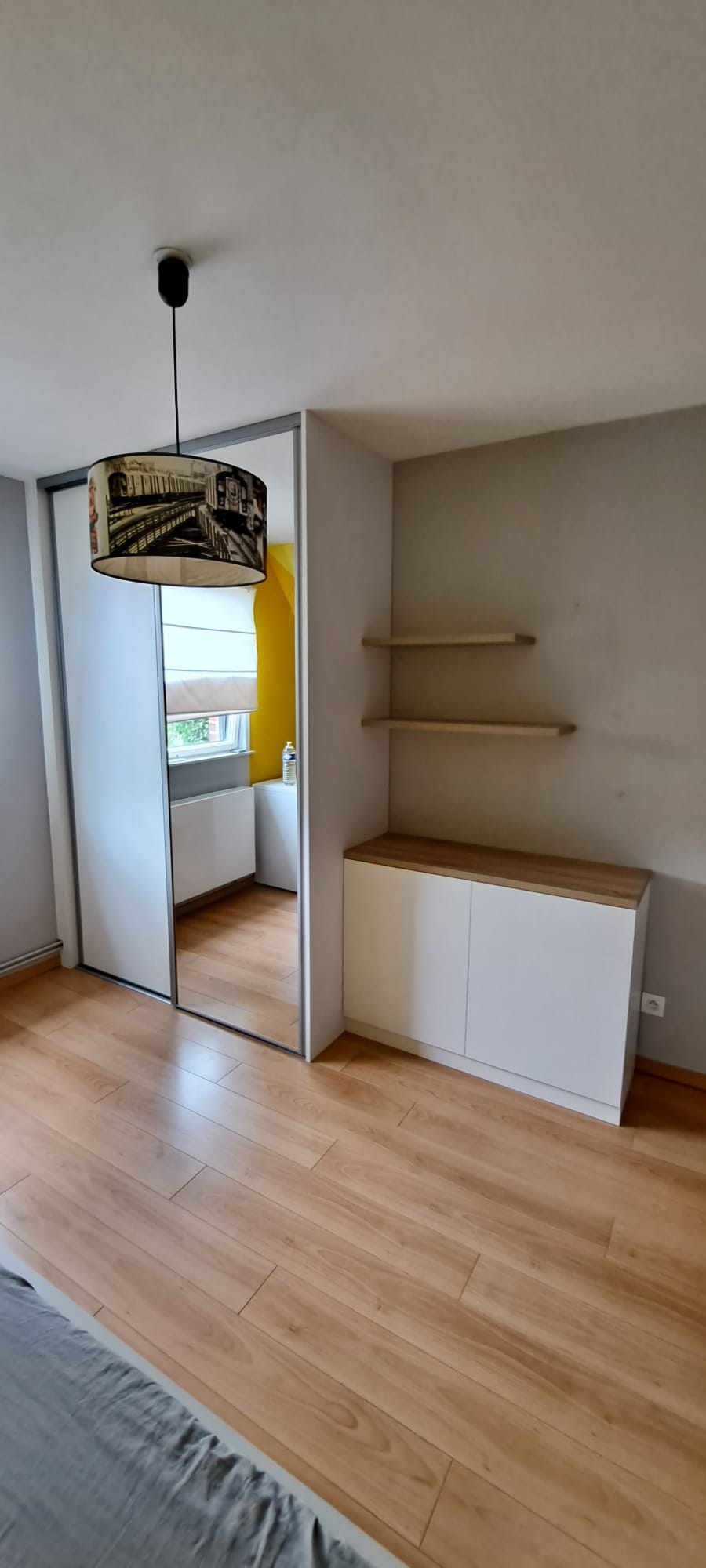 Nous avons installé ce magnifique dressing sur-mesure dans une chambre de fille à Hem. Ce projet comprend le placard à double porte avec le miroir, les deux étagères en coin ainsi que le meuble de rangement deux portes.