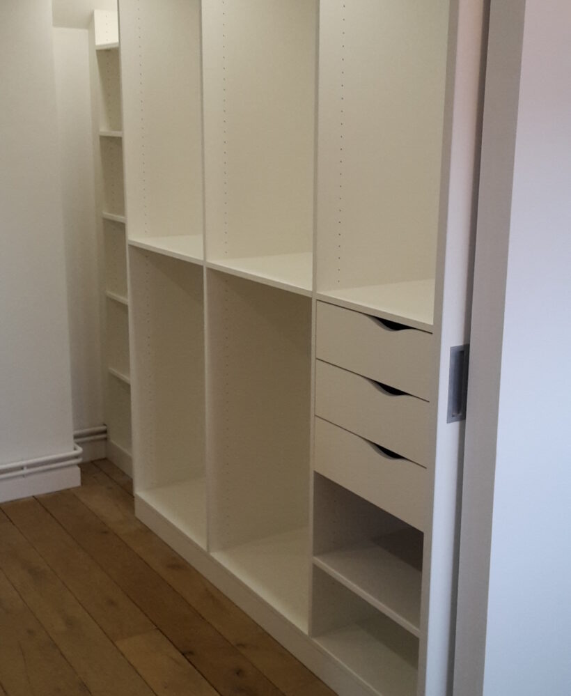 Nous avons également installé une séparation de pièce avec poignées encastrées . L’agencement est conçu intégralement en mélaminé blanc .