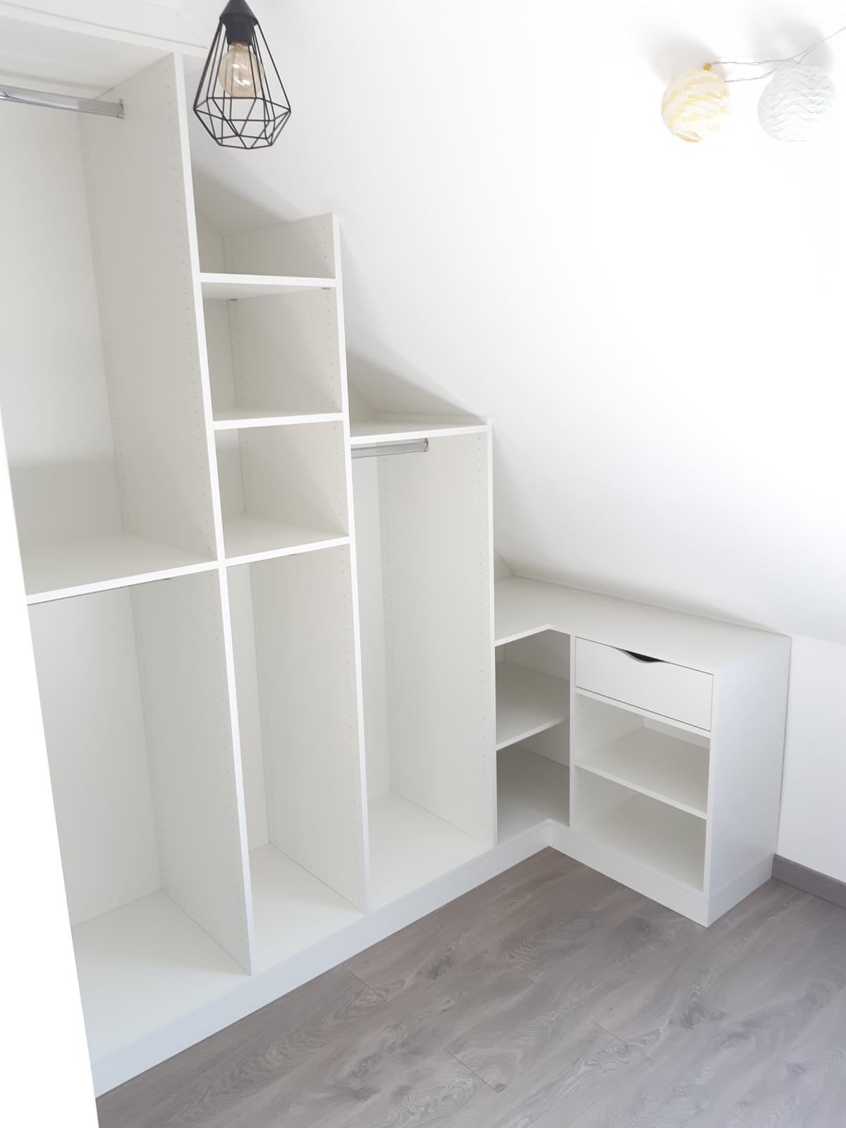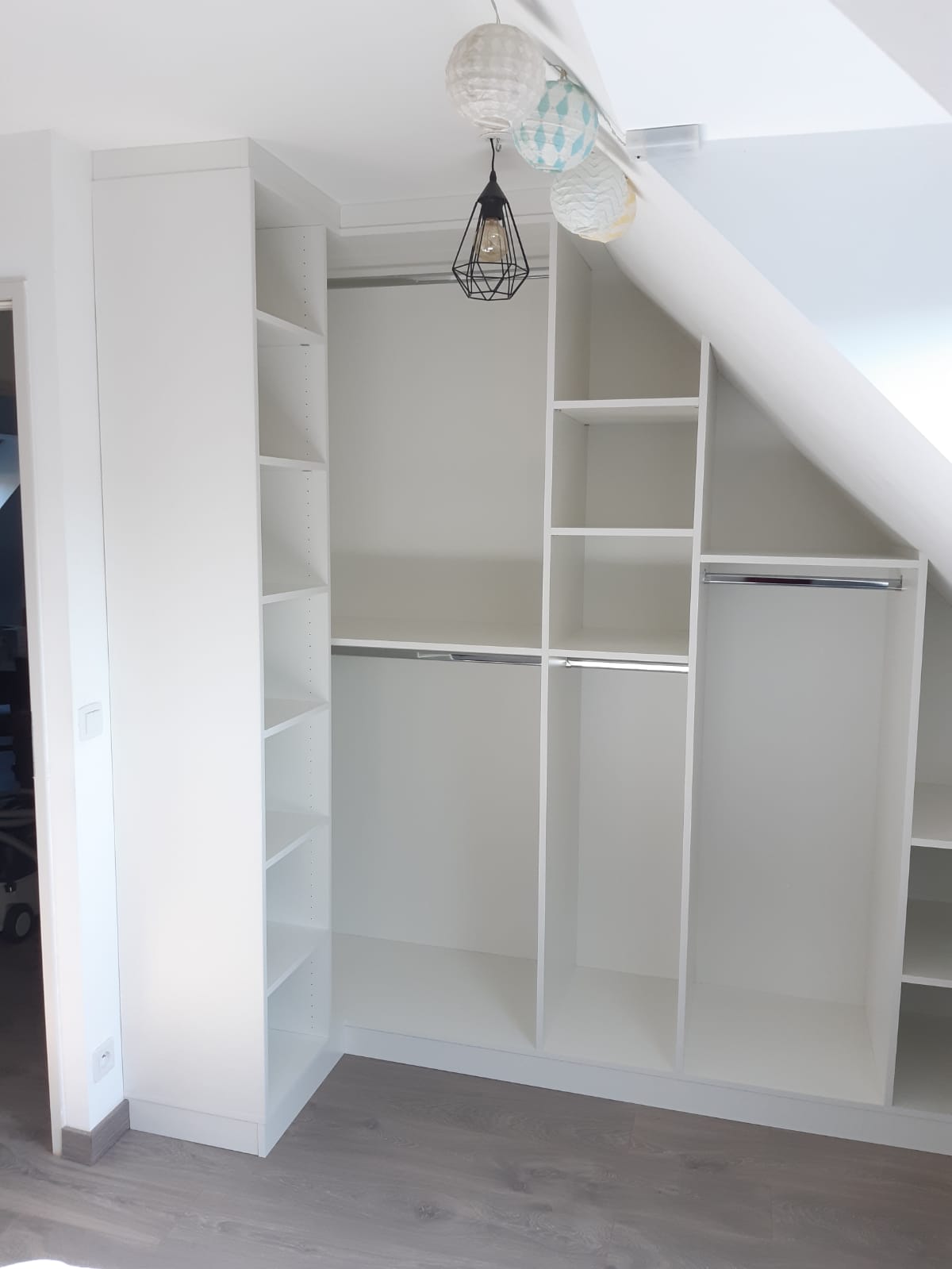 Sur ce projet, nous avons été dans l’obligation de s’adapter à la sous pente. L’espace est difficile à utiliser et seul le sur mesure permet d’obtenir un résultat précis qui s’adapte aux besoins des clients.