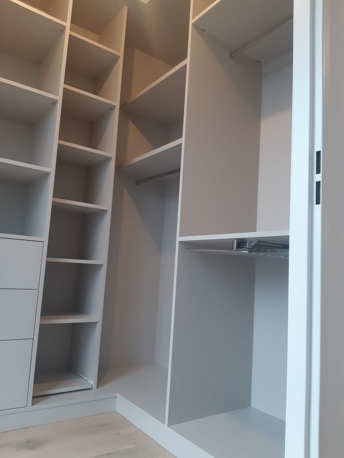 Dans un premier temps, le côté pratique a été développé. Nous avons cherché à optimiser un espace de passage. Pour cela, nous avons intégré de la penderie, des étagères, de tiroirs ainsi que certains accessoires (Type porte pantalon, étagère coulissante). Ainsi, nos clients bénéficient maintenant de plusieurs espaces de rangements.