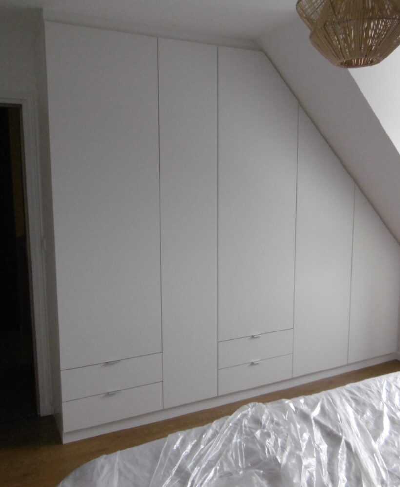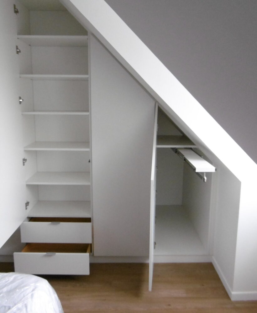 Un dressing sous mansarde à Pont à Marcq plus qu’optimisé ! En effet, nous avons utilisé chaque m² de cette chambre dans le but d’obtenir un maximum de rangement. Pour ce projet, la solution du sur mesure a été privilégiée. En effet, cette méthode permet d’obtenir un résultat des plus précis possible en optimisant au mieux l’espace disponible dans la pièce.