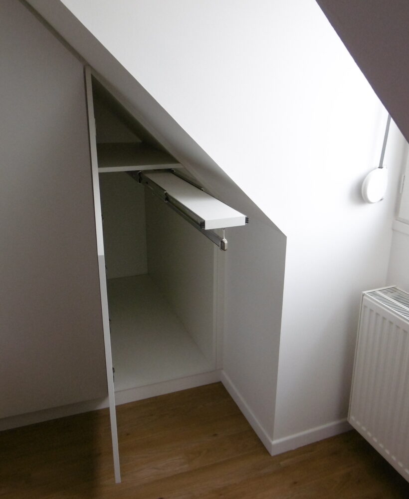 Enfin, ce dressing sous mansarde à Pont à Marcq utilise tout l’espace disponible de la pièce et répond à l’ensemble des critères fixés par nos clients.