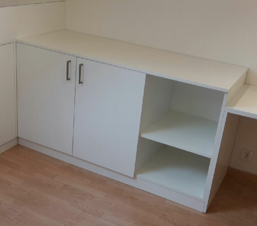 Cela permet de rythmer l’agencement sur mesure et de dissocier les fonctions différentes … L’agencement a été conçu en mélaminé blanc lisse et en basalte .