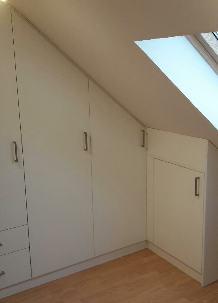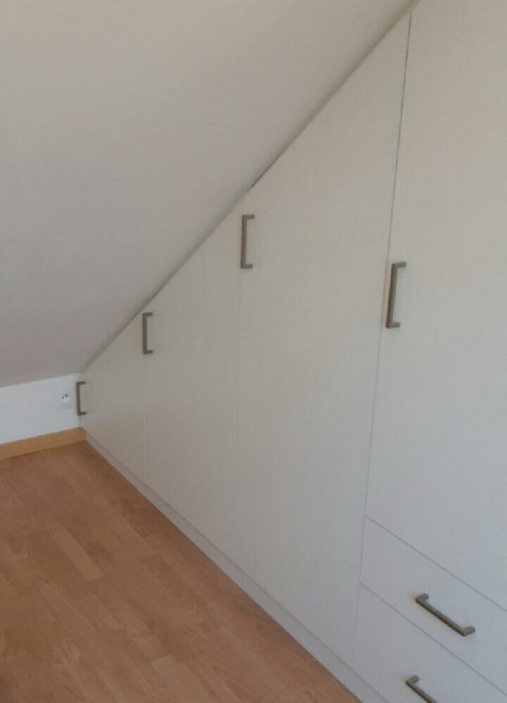 Un dressing sous mansarde de face est également en liaison avec la partie énoncée précédemment . Ce dernier admet des rangements dissimulés . Effectivement les meubles sont partiellement réalisé avec des fonds de manière à pouvoir stocker des choses derrière les agencements . Cette gestion de l’angle permet d’optimiser les espaces de rangements perdus.