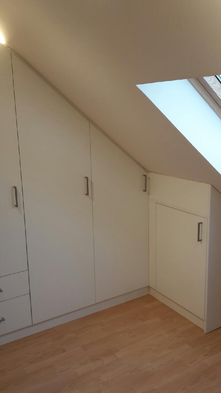 Un dressing sous mansarde de face est également en liaison avec la partie énoncée précédemment . Ce dernier admet des rangements dissimulés . Effectivement les meubles sont partiellement réalisé avec des fonds de manière à pouvoir stocker des choses derrière les agencements . Cette gestion de l’angle permet d’optimiser les espaces de rangements perdus.