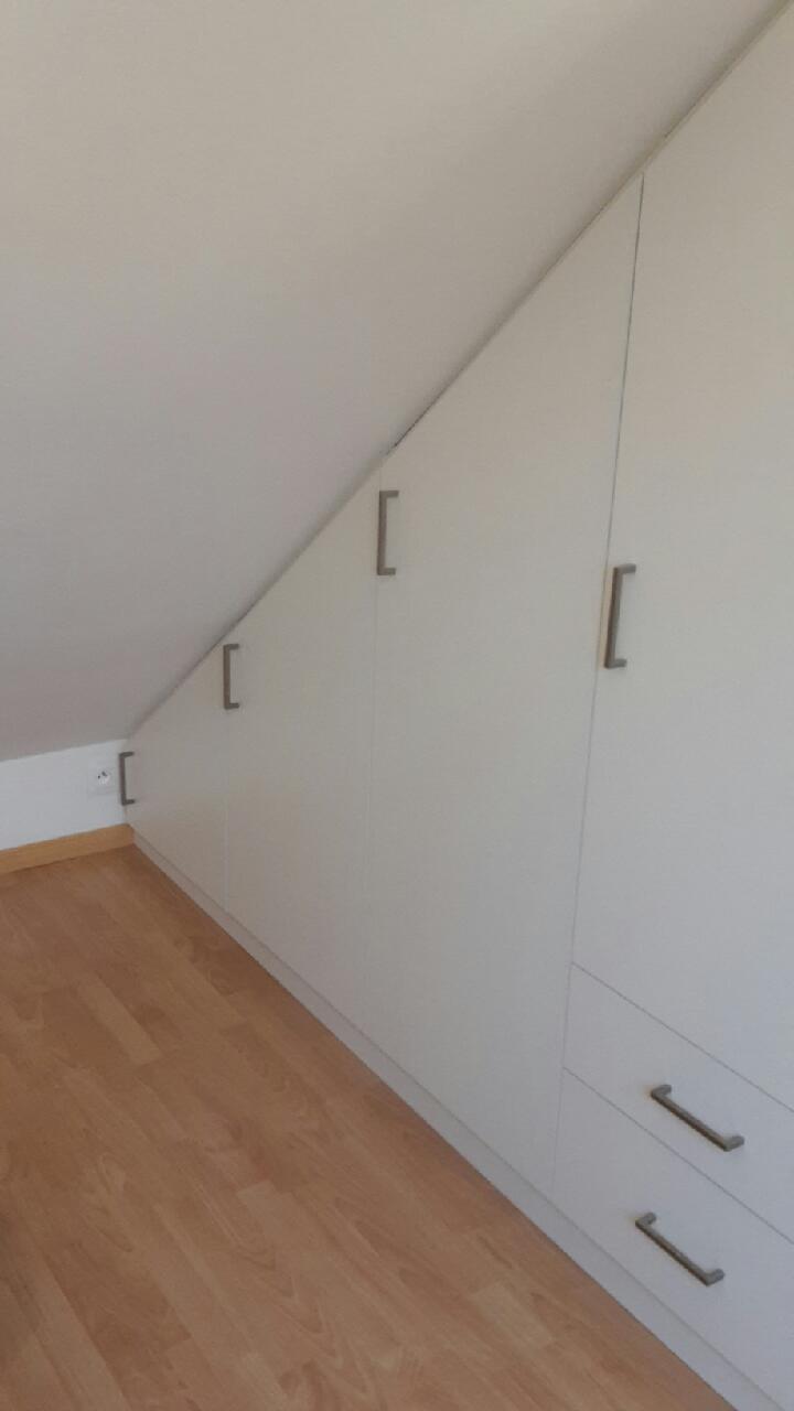 Aménagement sur mesure d’un comble entier avec un dressing sous pente fermé par des portes battantes avec une partie bureau à Tourcoing .