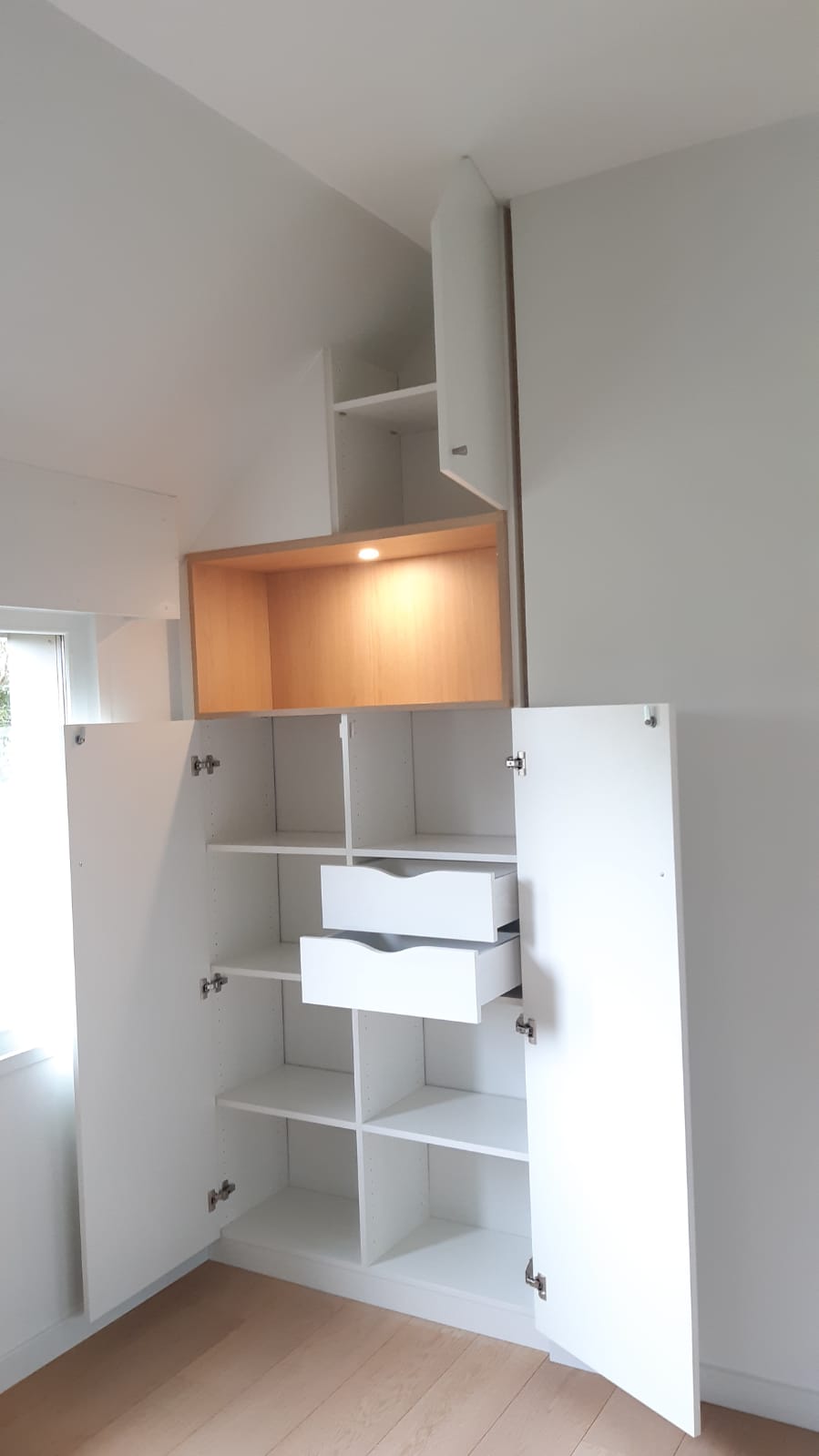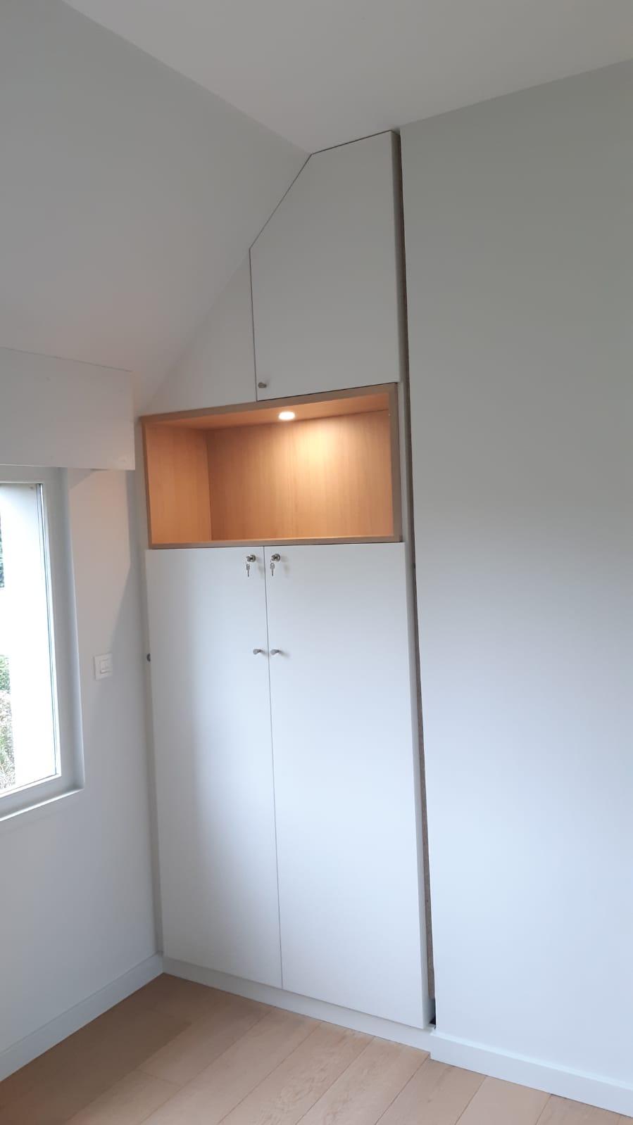 Nous avons réalisé un dressing sous pente à Wambrechies. Ce dressing a été réalisé entièrement sur mesure pour la simple raison qu’il y avait un angle important dans la pièce. Ce type de fabrication permettant d’optimiser au mieux l’espace disponible d’un endroit, nous avons donc choisi de l’utiliser. Afin de satisfaire au mieux nos clients, nous avons fait le choix de nous concentrer sur deux axes principaux nécessaires au bon fonctionnement du projet.