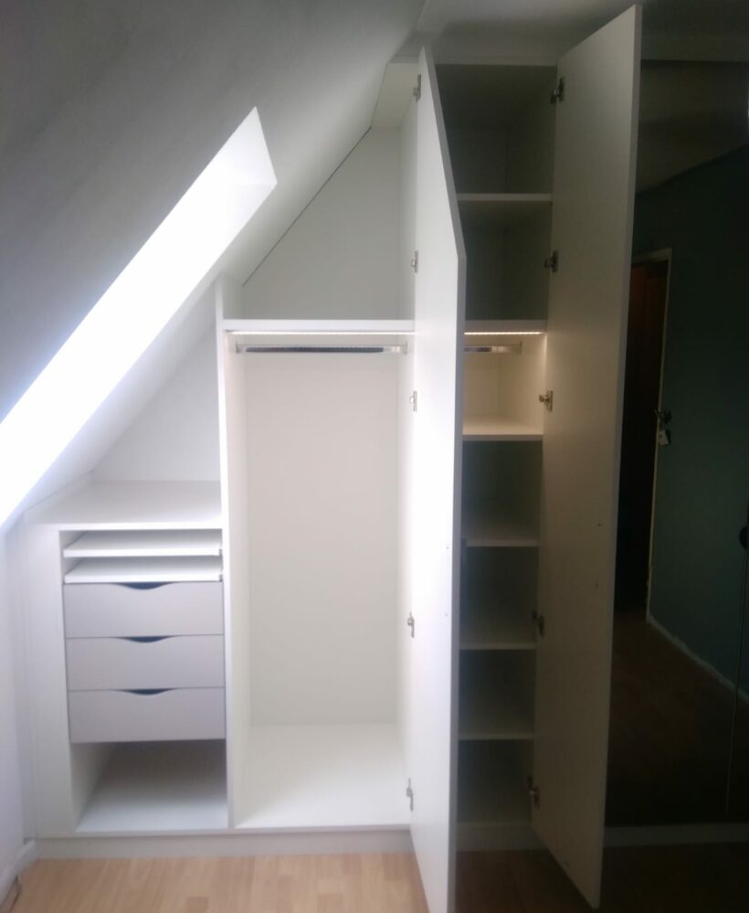 Nous avons conçu un dressing sur mesure sous la mansarde dans cette pièce destinée principalement au rangement.