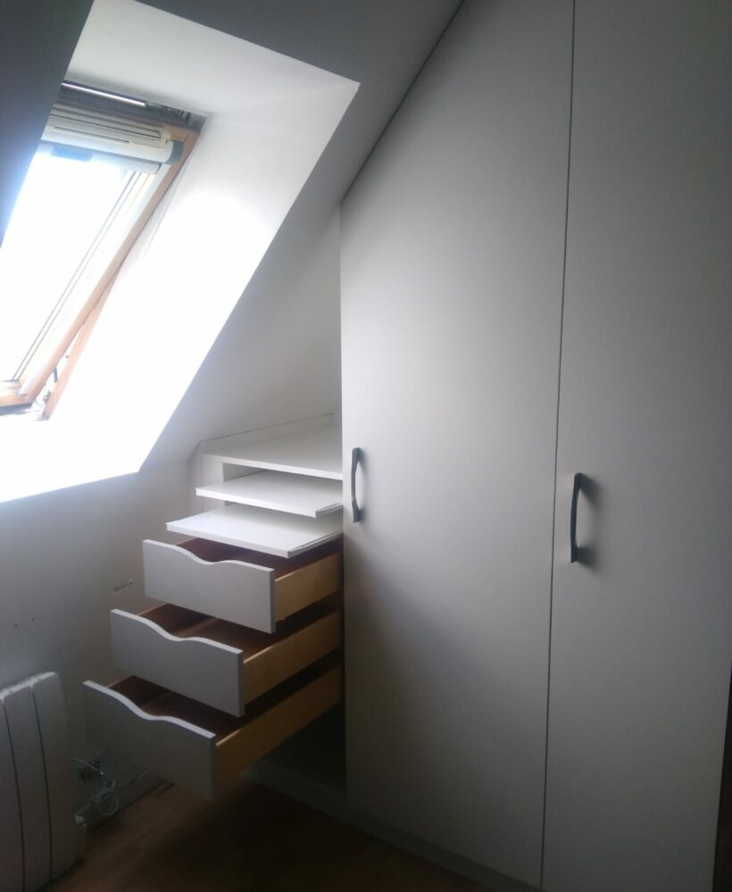 Ce dressing sous la mansarde constitue un excellent investissement pour nos clients. En effet, l’espace est difficilement exploitable. Le sur mesure nous a permis d’utiliser cet espace disponible en l’optimisant au mieux.