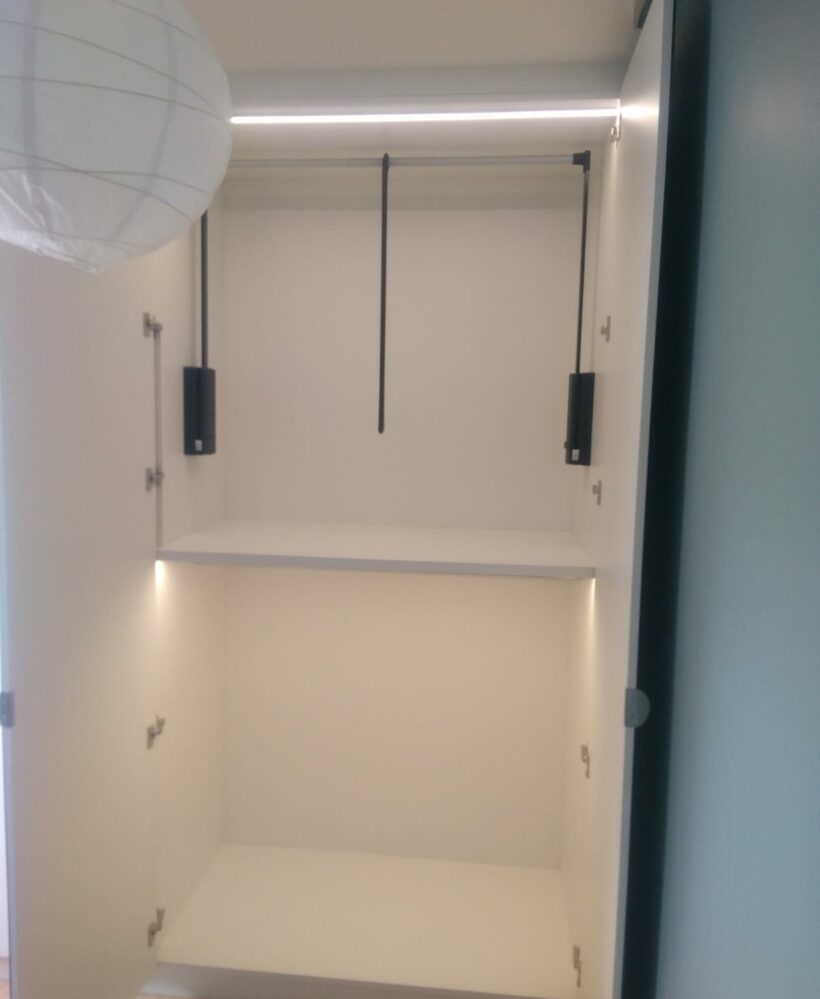 Ainsi, nous avons intégrer des bandes LED à l’intérieur du dressing au niveau des penderies. Cela permet de rajouter du cachet à la pièce mais aussi d’améliorer le confort visuel de notre client.