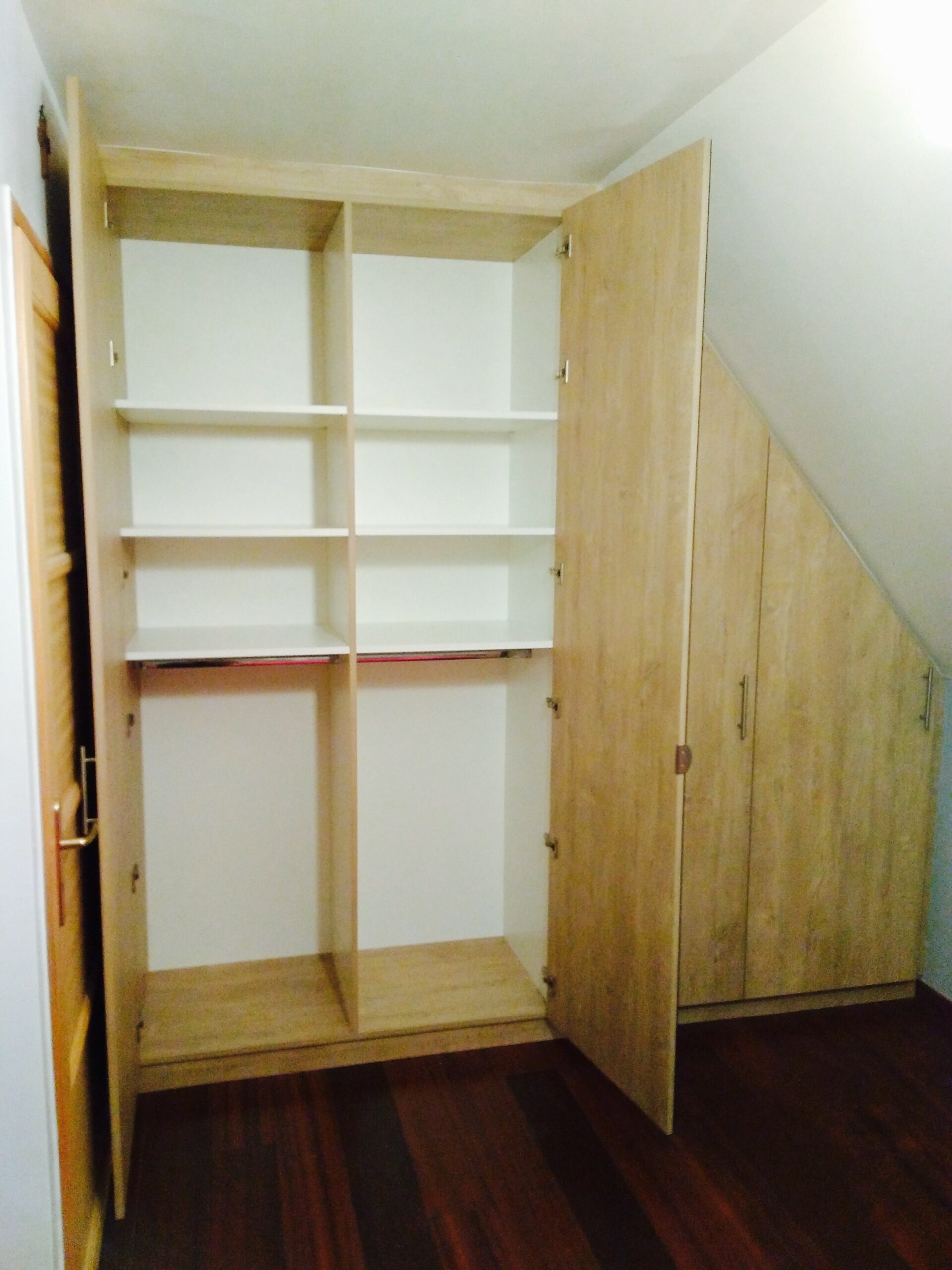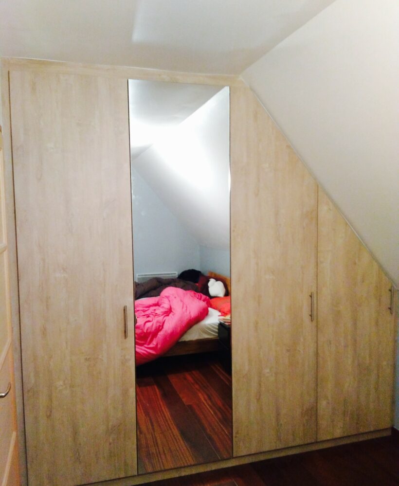 Il s’agit d’une conception sur mesure d’un dressing sous pente fermé par des portes ouvrantes avec une porte en miroir .