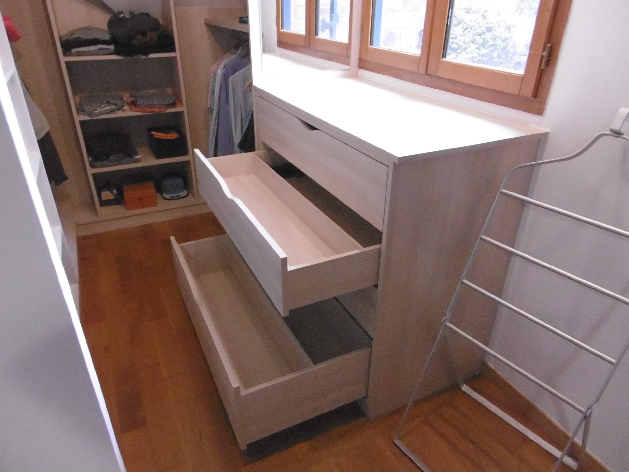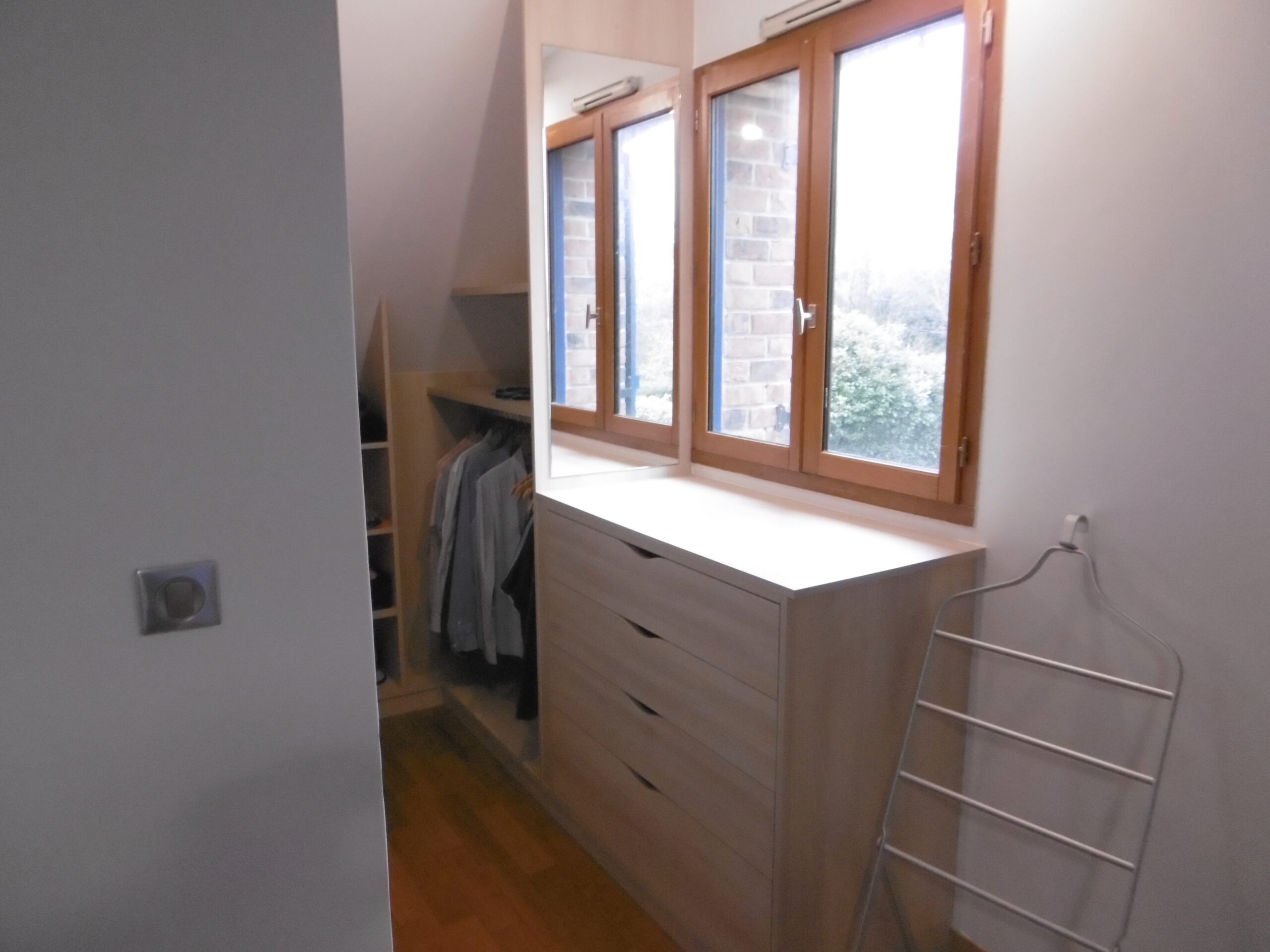 Dans un premier temps, nous avons développé le côté pratique du dressing. Pour cela, nous avons réaménagé un renfoncement dans une pièce destinée aux rangements. En effet, on y trouve un espace pour laisser pendre les chemises, vestes, etc… un autre pour les pulls et les t-shirts pliés. Ces zones sont de toute taille, ce qui permet d’y stocker des affaires plus ou moins imposantes. De plus, il y en à beaucoup, ce qui permet de structurer le rangement. Enfin, nous avons installé également une commode sur mesure pour ranger les sous-vêtements.