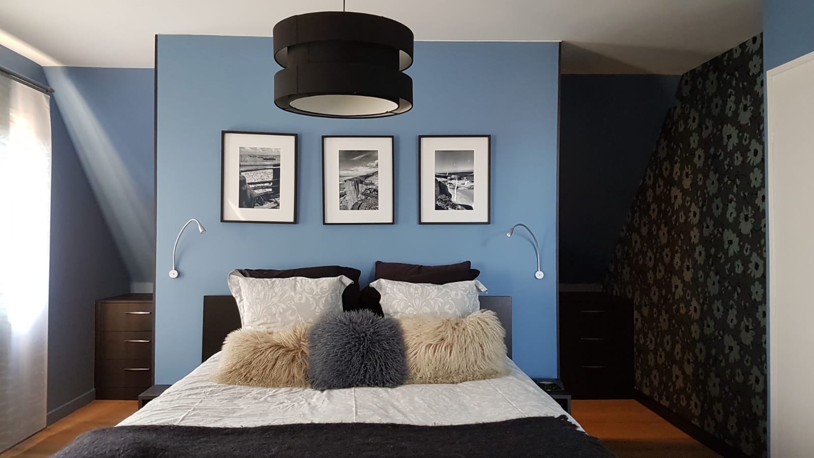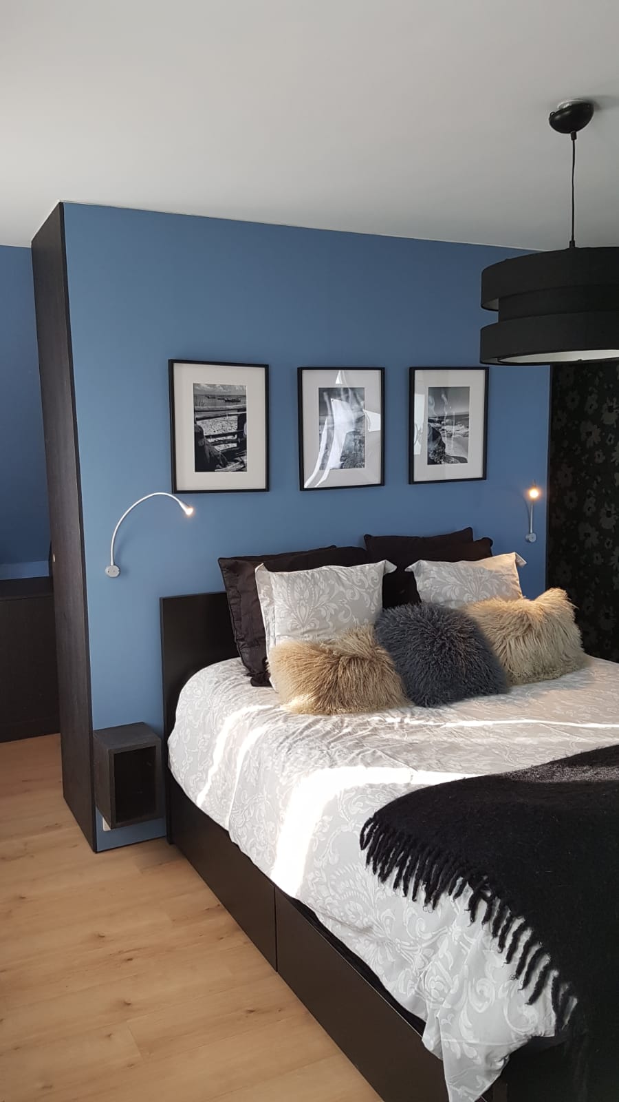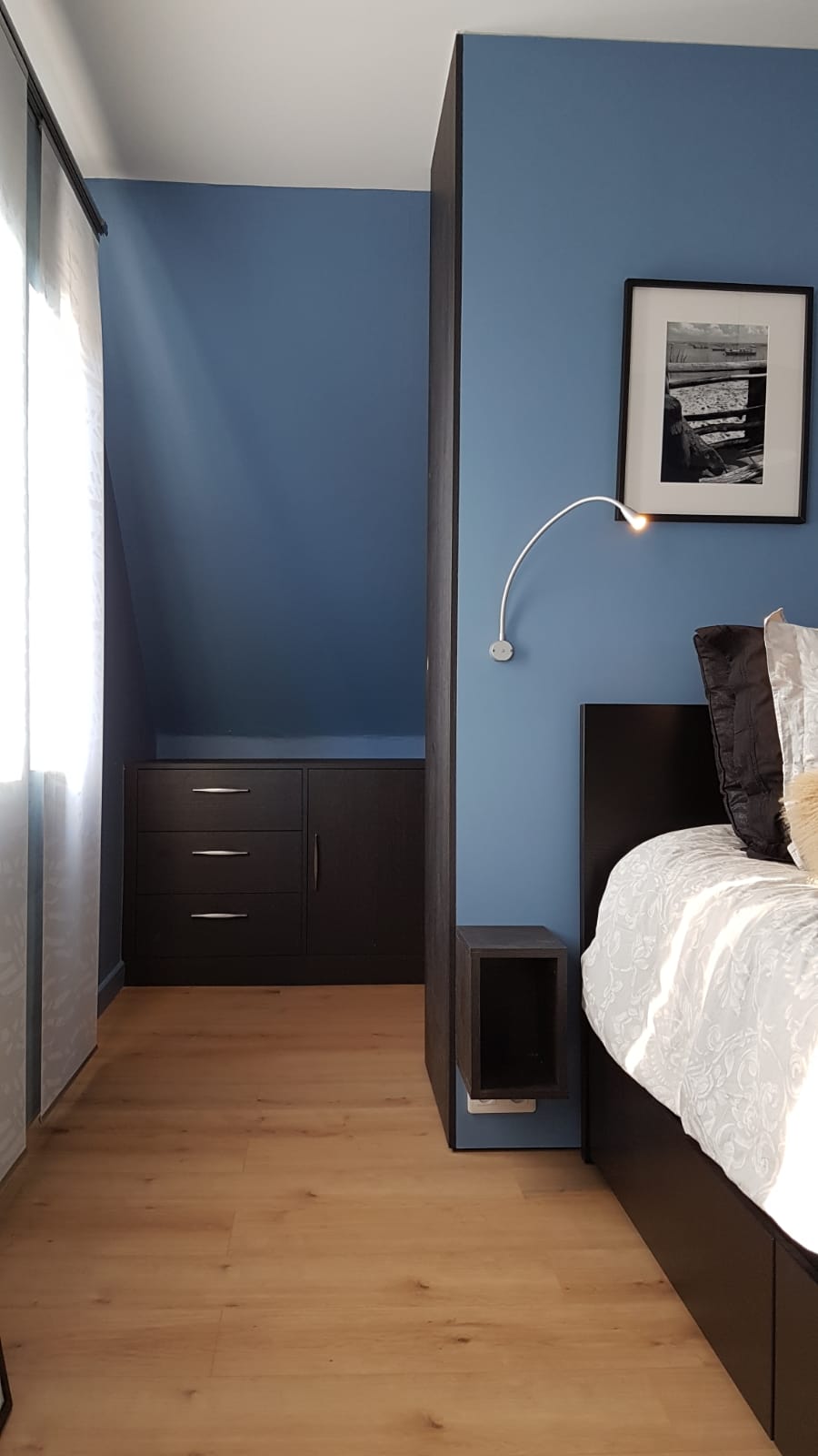 Nous avons repensé l’espace nuit de l’espace rangement par une cloison qui fait office de tête de lit. Sur cette dernière, nous avons ajouté des chevets ouverts ainsi que des liseuses pour les lectures du soir. Puis, derrière, nous avons aménagé un dressing ouvert et sous pente.