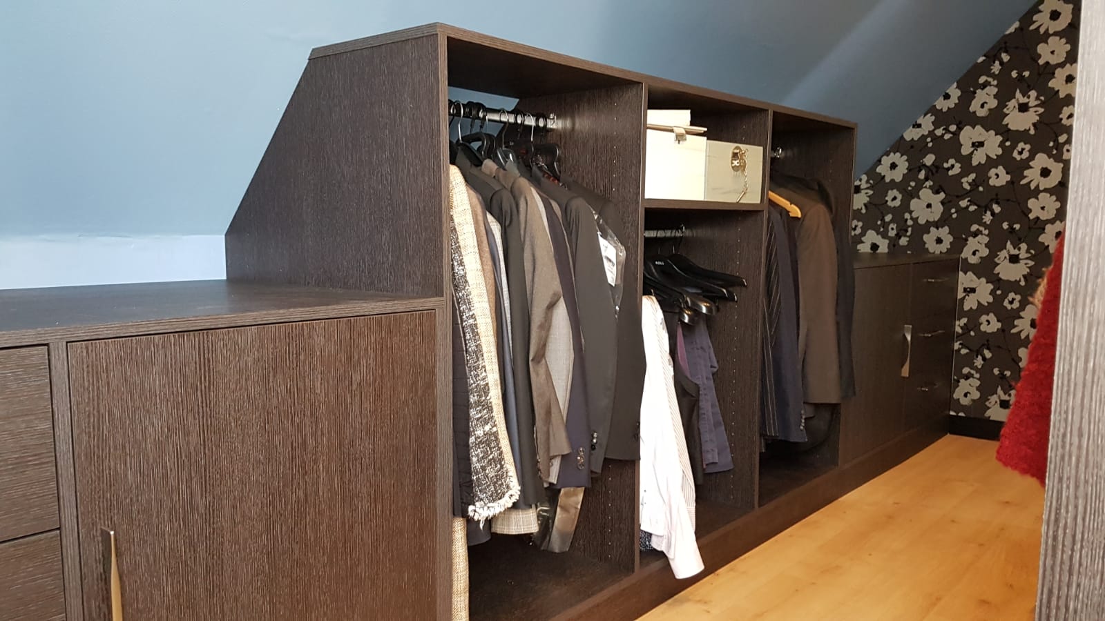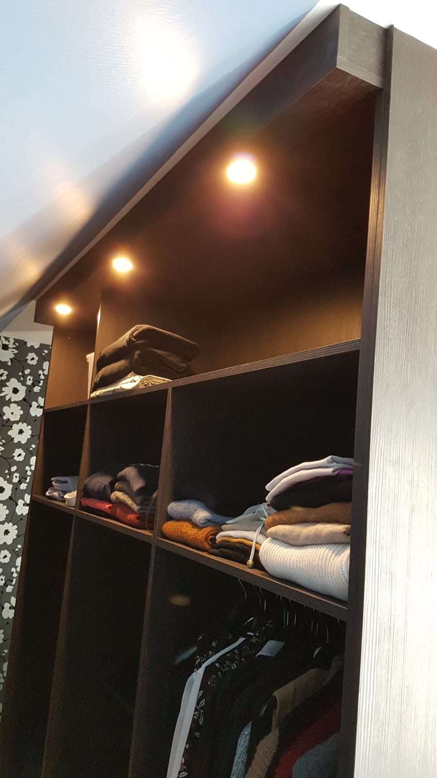 Il est complètement fonctionnel et pratique. En effet, Il est composé en partie de penderie, d’étagères et de tiroirs pour y ranger des sous-vêtements, des accessoires… De plus, Pour une meilleure visibilité et un esprit chaleureux , nous avons installé des spots sur les meubles les plus hauts.