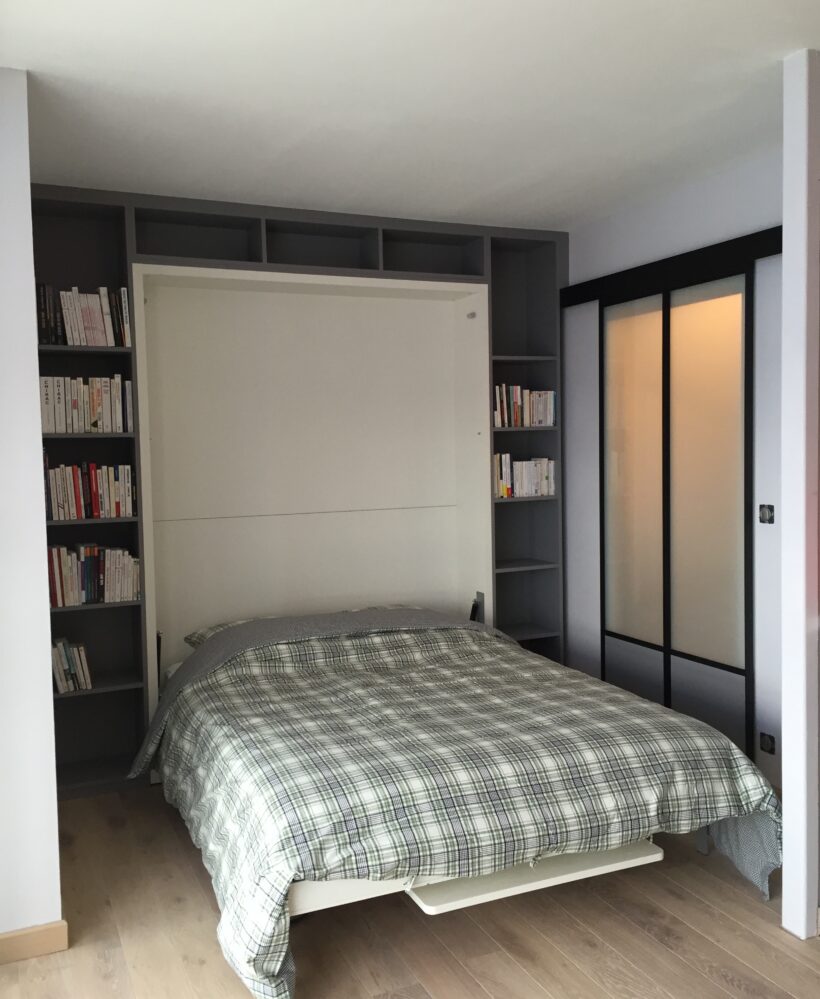 Conception sur mesure d’une bibliothèque autour d’un lit escamotable deux personnes avec option table .