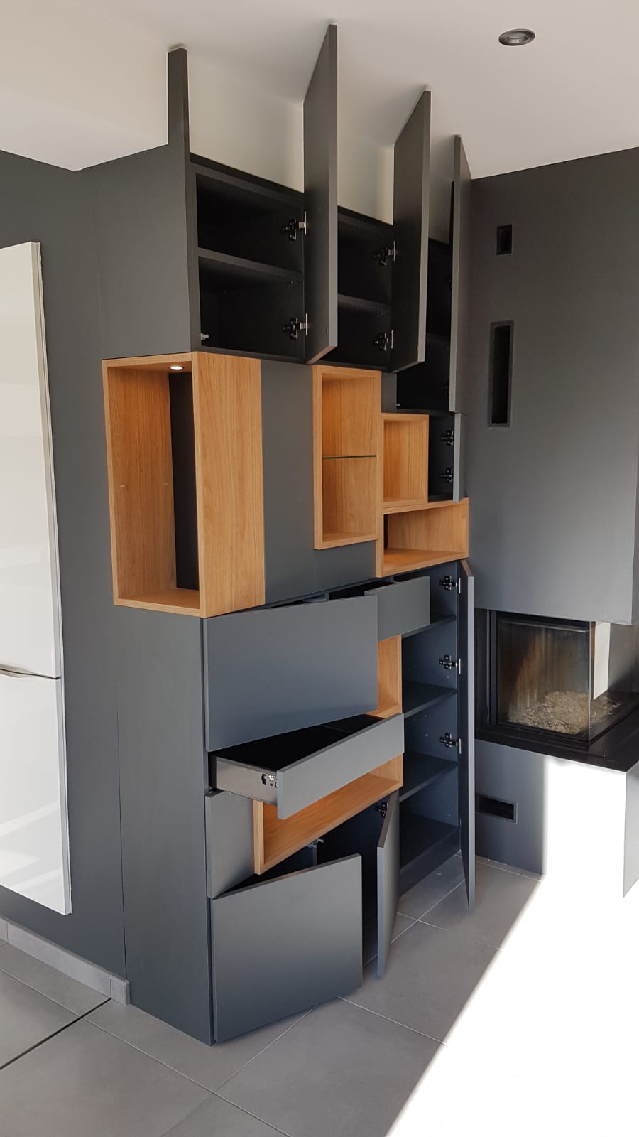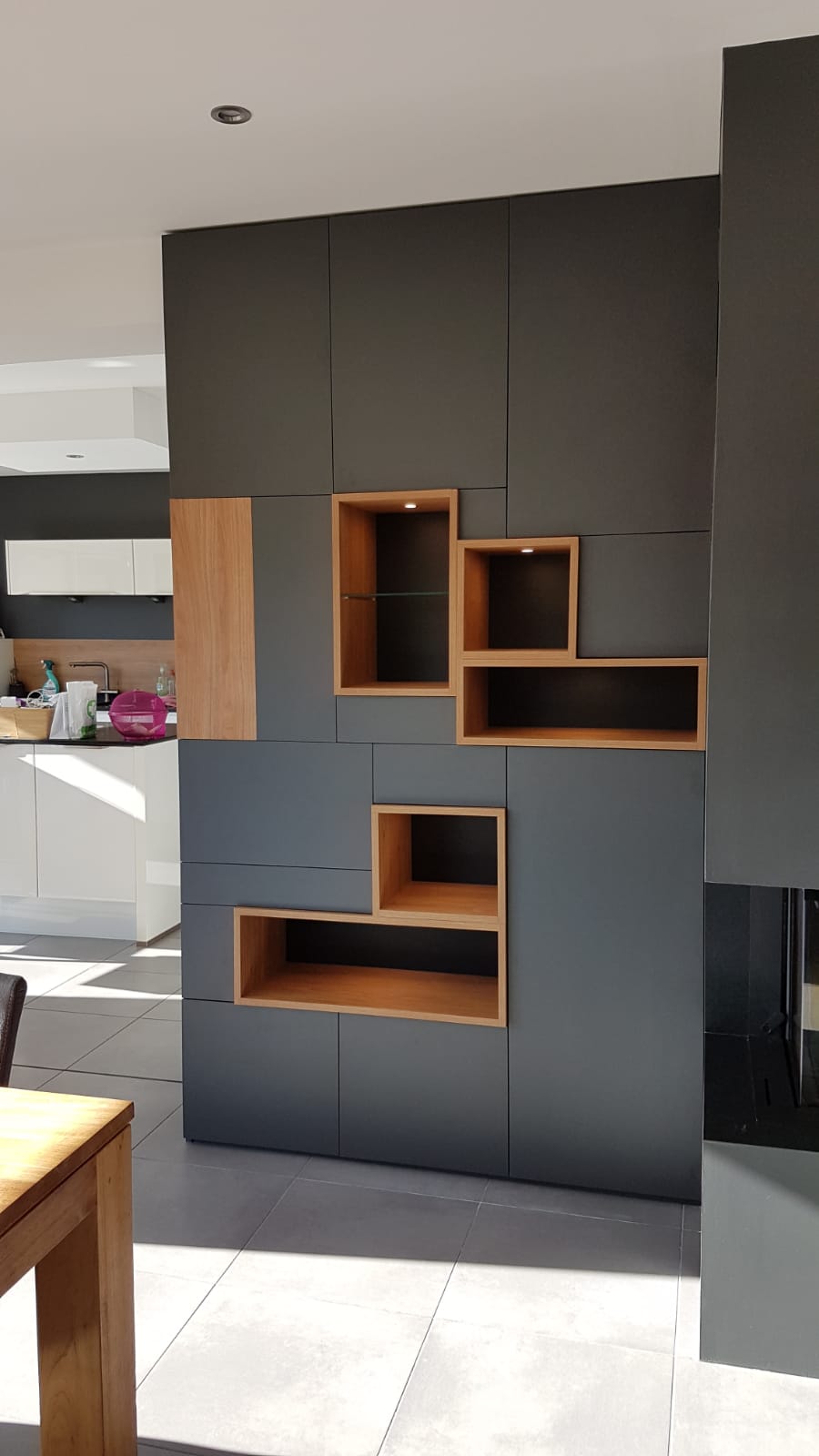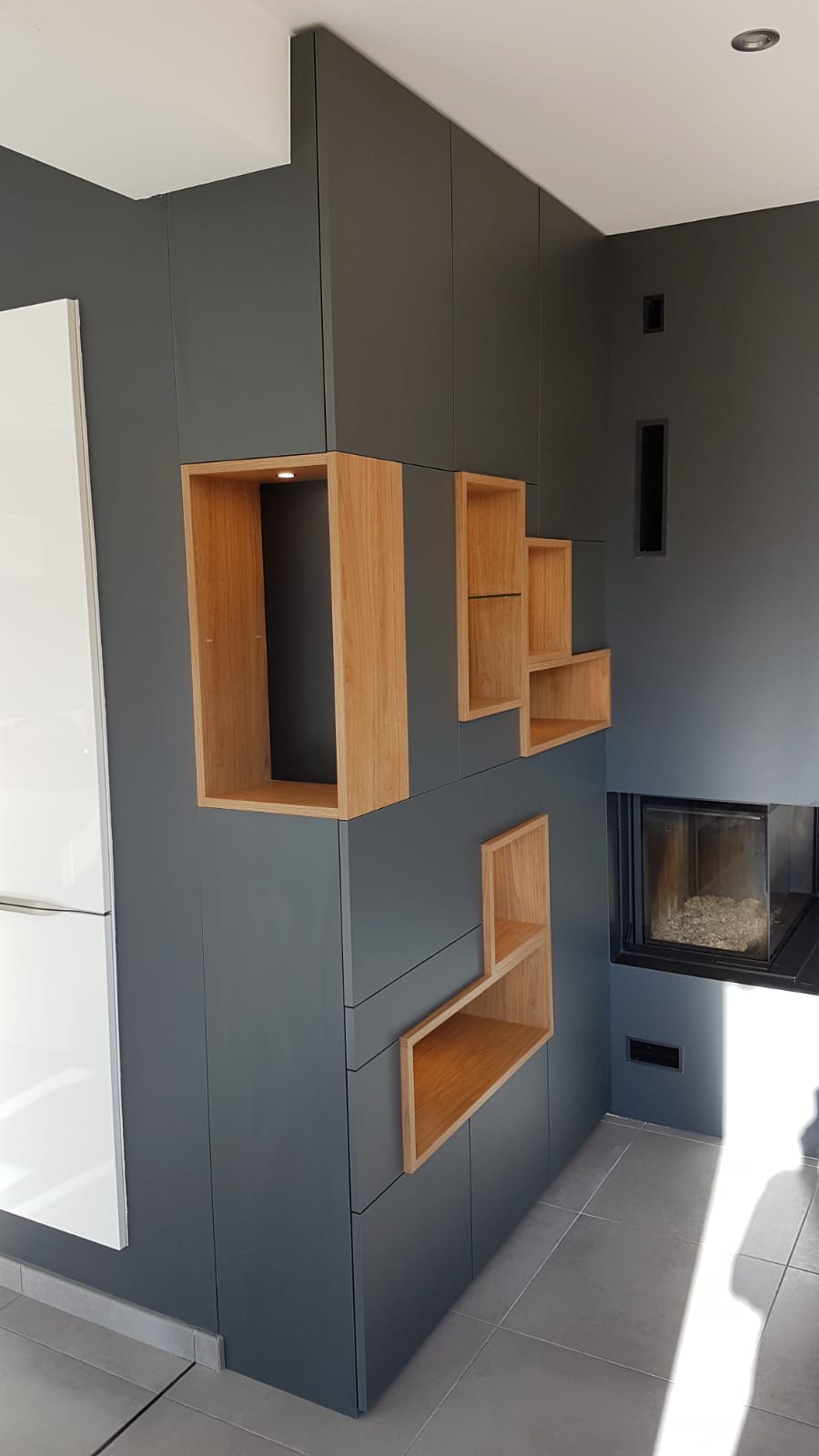 Nous avons réalisé un meuble de rangement complètement déstructuré à côté d’une cheminée . En effet , nous avons utilisé le pan de mur qui est dans le prolongement de la cheminée pour optimiser l’espace.