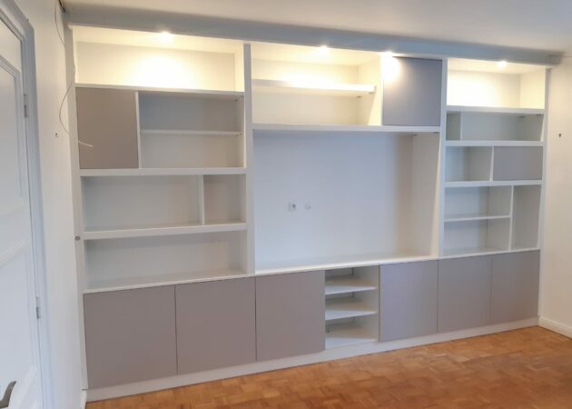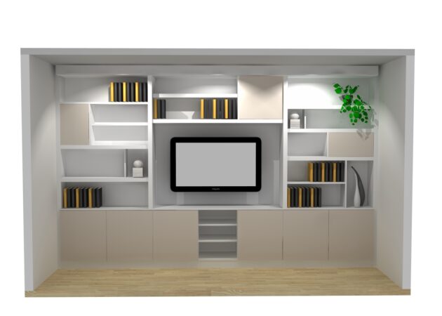 Afin d’optimiser au mieux le confort de nos clients, nous avons intégré beaucoup de zones de rangements ouvertes. Cela permet à ces derniers de pouvoir y placer de la décoration à leurs goûts. Ensuite, nous avons également placé des espaces fermés destinés à recevoir du rangements tels que des DVD par exemple.