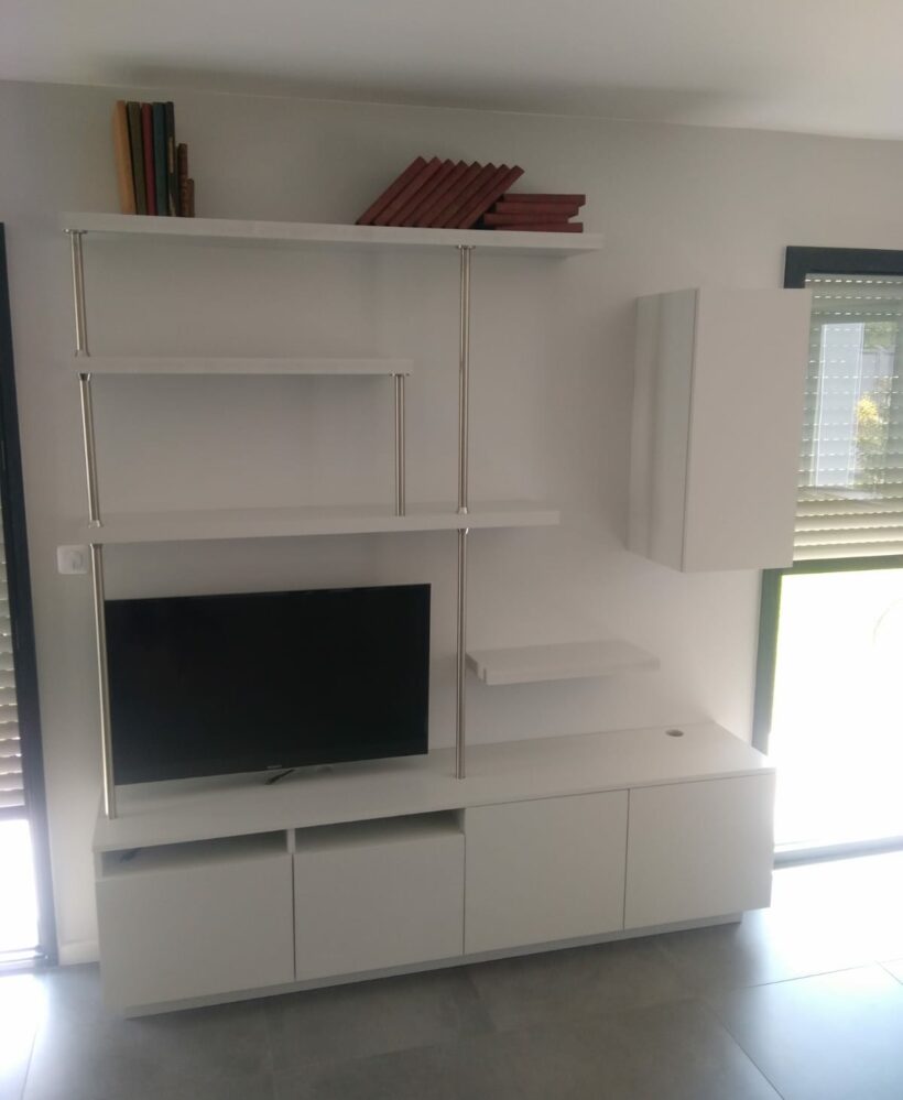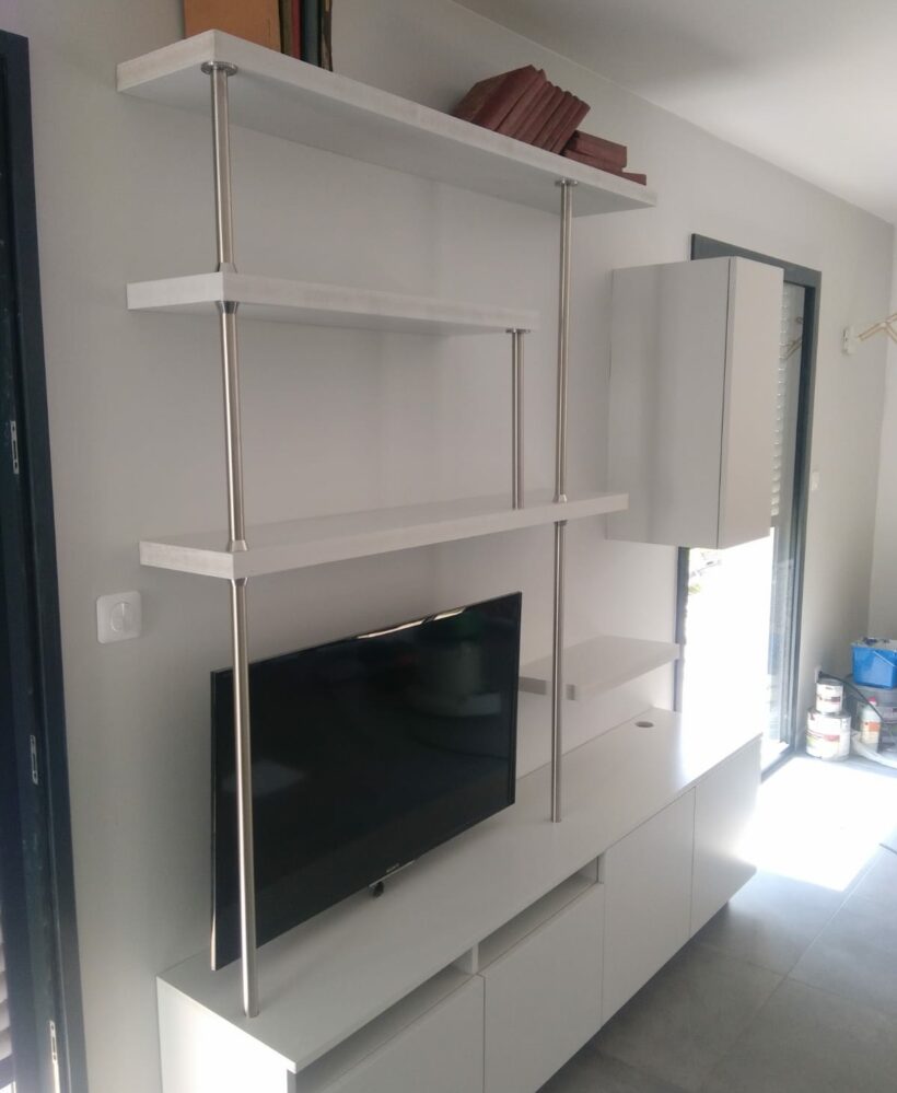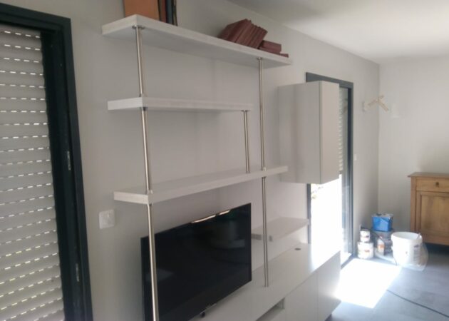 Ce meuble hifi sur mesure avec tube en inox se distingue grâce à son esthétisme. De plus, il s’intègre parfaitement dans la pièce. Les parties ouvertes peuvent être décorées alors que les parties fermées permettent de ranger des accessoires comme des DVD par exemple. Ainsi, ce meuble remplit l’ensemble des critères fixés par nos clients. Son design et son côté pratique font de lui un véritable atout dans la pièce. Il rajoute beaucoup de charme à cette dernière.