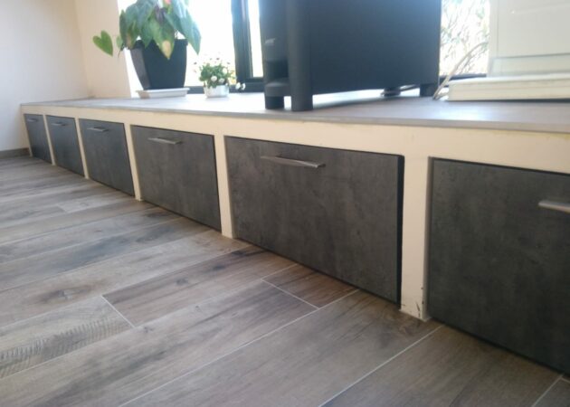 Sur ce meuble de rangement et sur ce cache compteur, nous souhaitions conserver des parties ouvertes. La principale raison de ce choix est que le résultat doit être esthétique. Ainsi, en laissant des espaces ouverts, cela donne de la valeur ajoutée au meuble. Enfin, notre client a la possibilité de les décorer à sa guise.