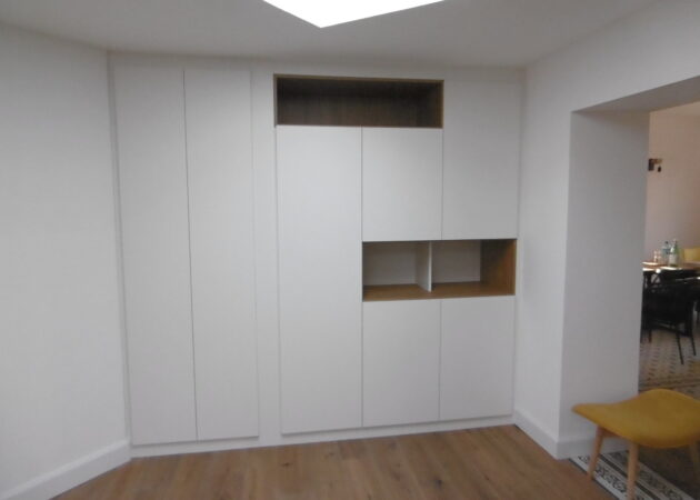 Enfin, à droite, on trouve un meuble sur mesure avec deux niches ouvertes en mélaminé noyer doré. Il est destiné à ranger différentes choses telles que des jeux de sociétés, de la vaisselle, des petits électroménagers …etc
